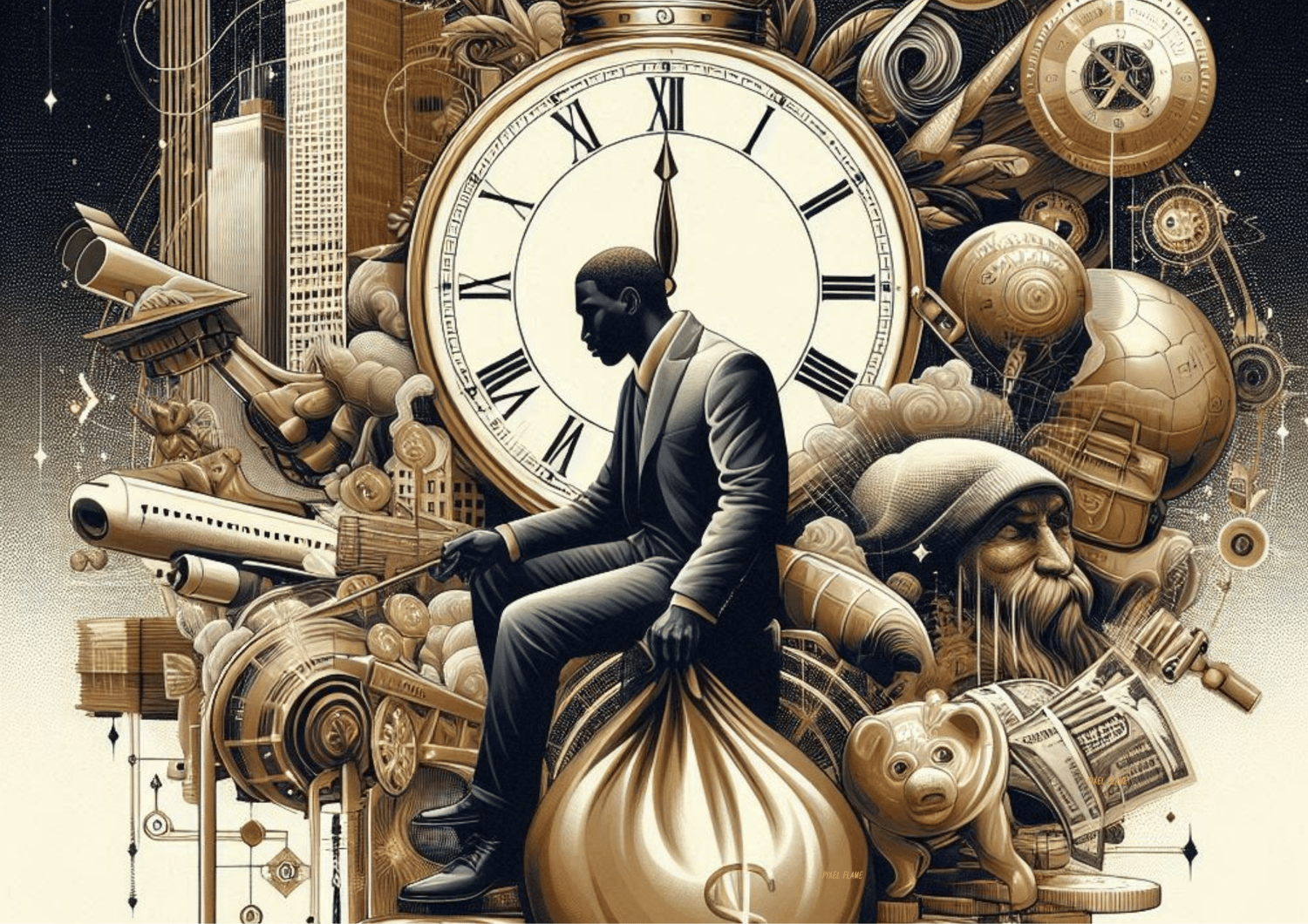 This digital artwork features a stylized composition with a figure seated on a sack, surrounded by various objects including clocks, gears, buildings, and currency. The figure is dressed in a suit, with a smooth, featureless surface replacing the head, suggesting themes of anonymity and identity. The background is filled with intricate mechanical details and urban elements, evoking a sense of time, finance, and the complexities of modern life.