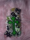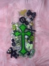 - Vibrant green-and-black cross design with 3D charms