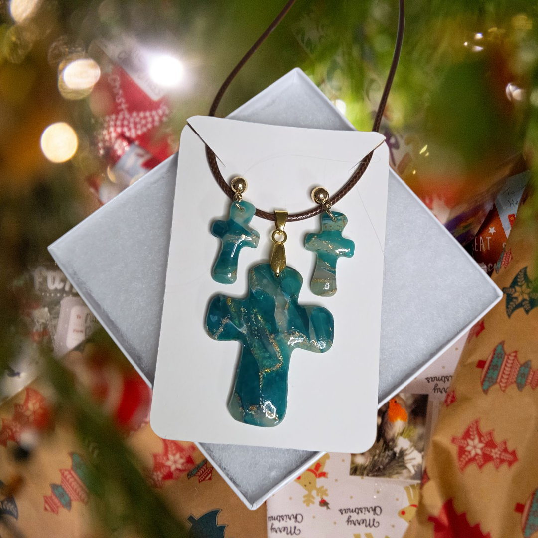 Polymer Clay Cross Gift Set in shades of Turquoise translucent clay.