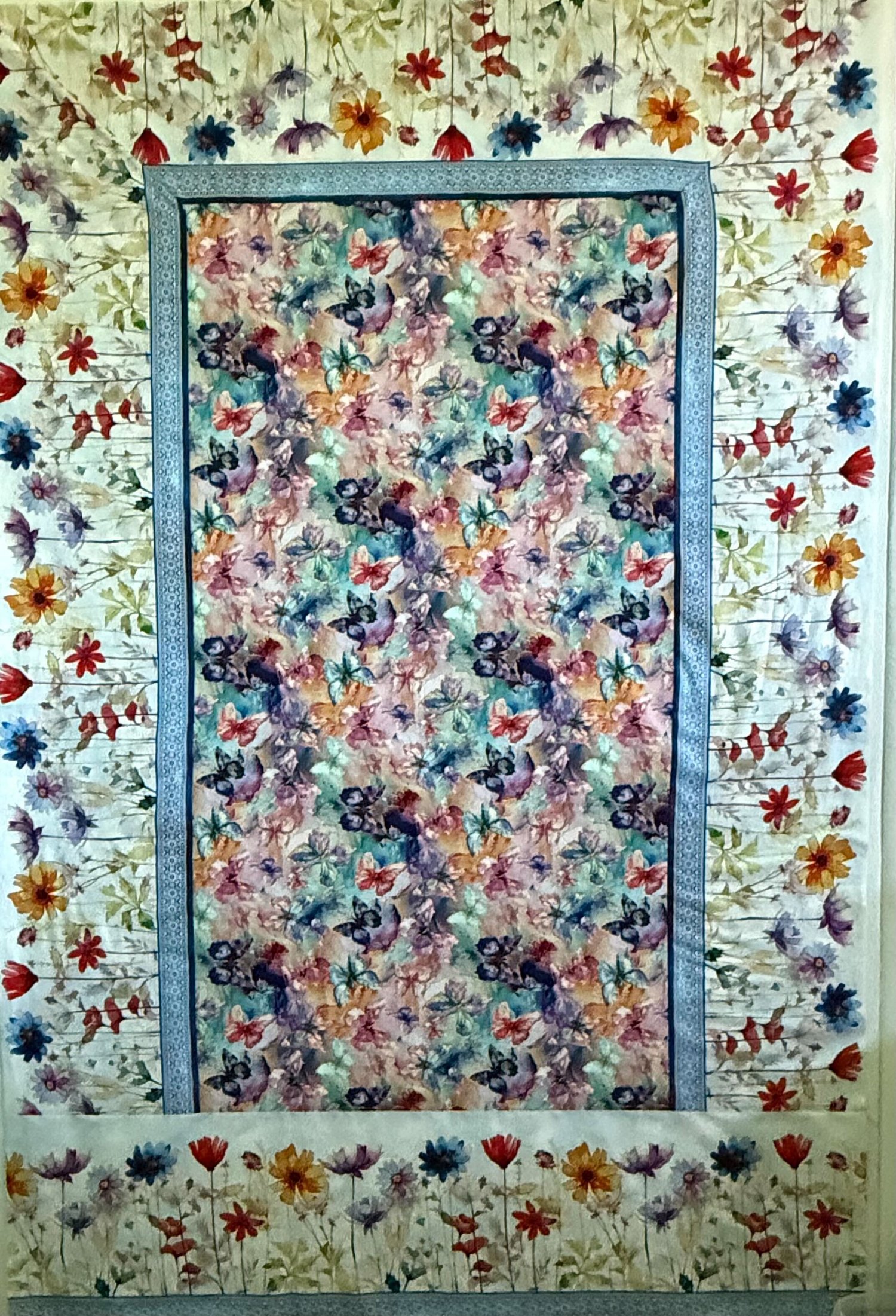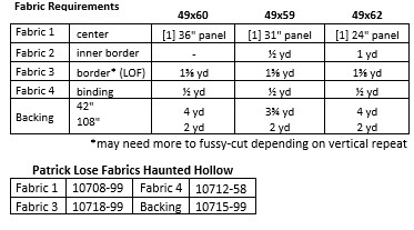 Simply a panel with a border—although it’s a different sort of border. It’s mitered at the top, with a single horizontal border for the bottom. It’s easy enough for beginner to sew up, and a quick quilt for anyone to make. Haunted Hollow fabric has [3] border stripes the same width, which are used for the sides and top and are mitered, The 4th stripe is wider than the others and is added as a long horizontal border. Adjustments for 31” and 24” panel are included.