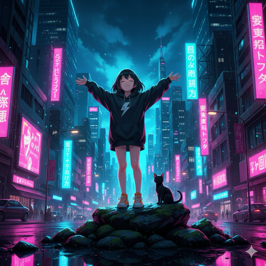 A vibrant cyberpunk girl illustration set in a glowing neon city, featuring futuristic details, bold colors, and a polished sci‑fi aesthetic.