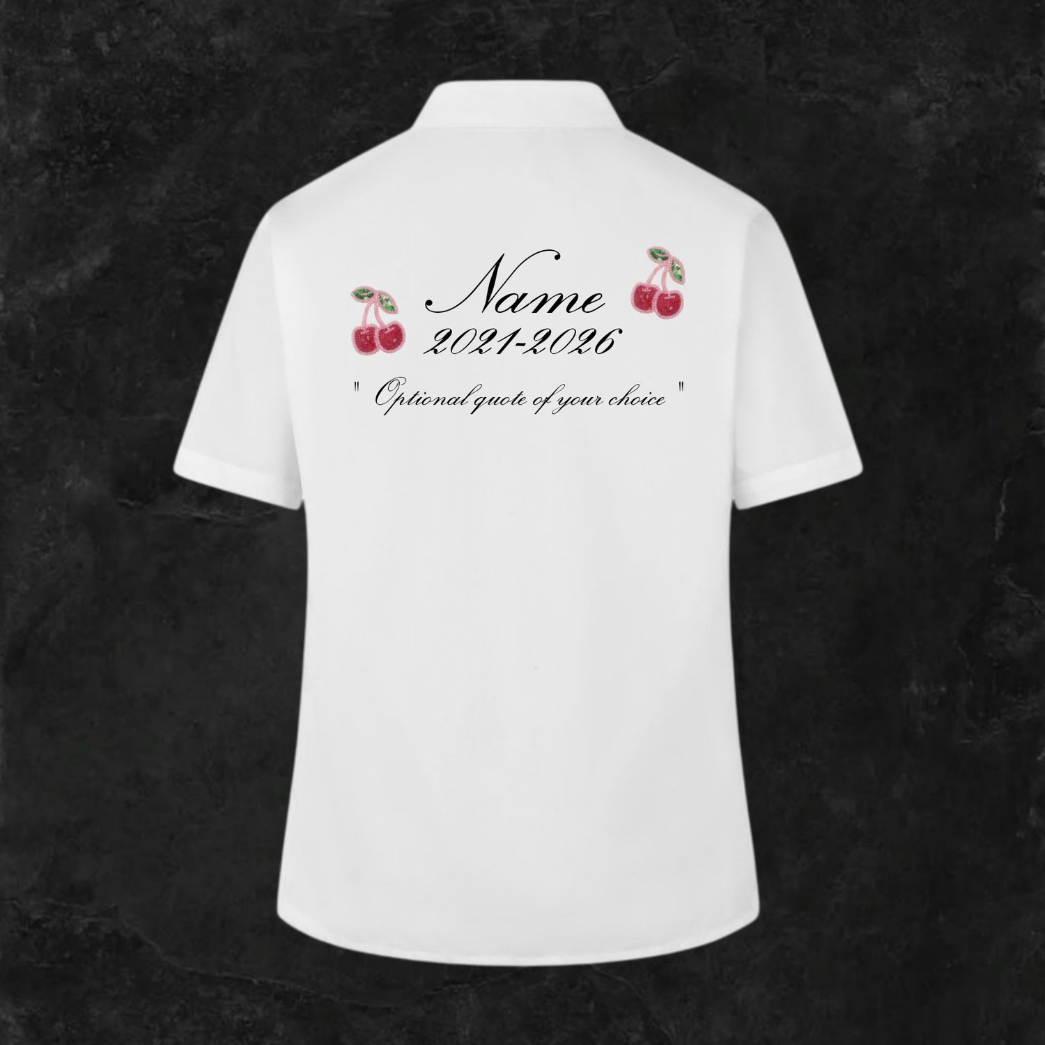 A cute and classy leavers shirt featuring embroidered bead cherry details, your name, leavers years, and an optional quote. The cherries are fully embroidered with bead detailing, adding texture and a premium finish while keeping the overall look soft and timeless.