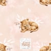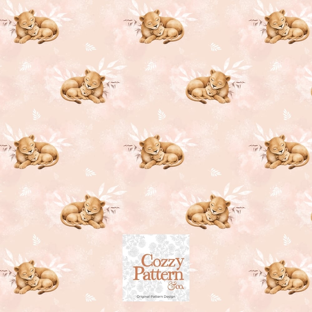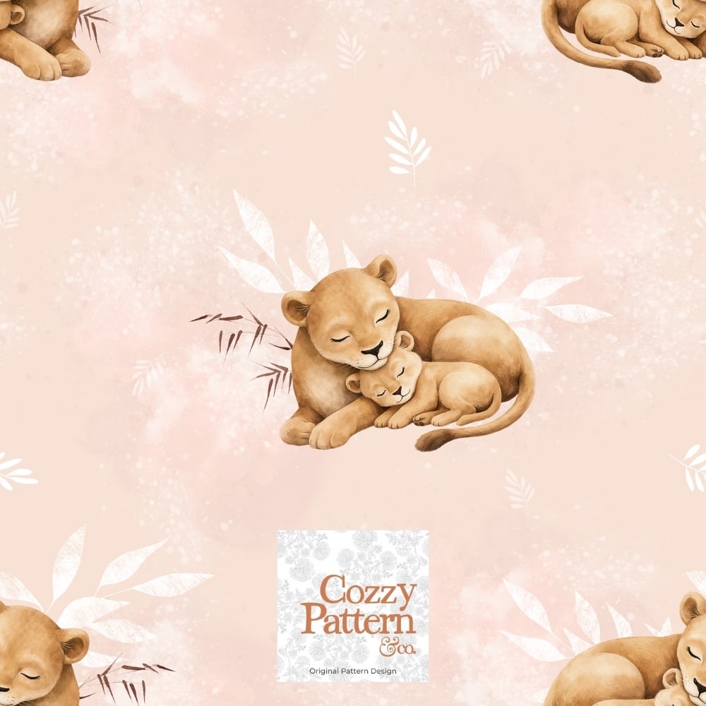 Create adorable baby and nursery projects with this sleeping lion cub seamless pattern, a soft safari-inspired design featuring a mother lion cuddling her baby surrounded by delicate leaves, butterflies and subtle botanical elements.