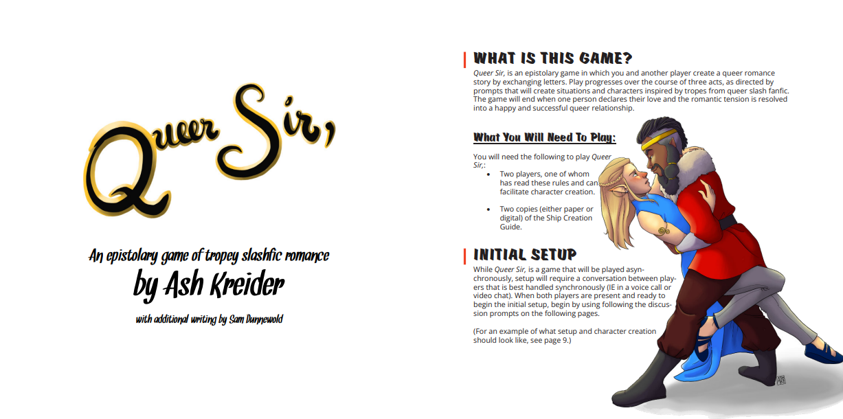 Queer Sir, is an epistolary game of trope-y queer romance for two players in which you create a queer romance story by exchanging letters. Play progresses over the course of three acts, as directed by prompts that will create situations and characters inspired by tropes from queer slash fanfic. The game will end when one person declares their love and the romantic tension is resolved into a happy and successful queer relationship.