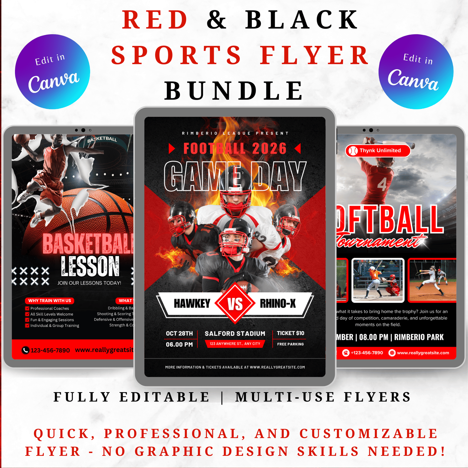 Make your promotions stand out with this bold red & black sport flyer bundle, fully editable in Canva! No design experience needed—just open the template, edit the text and images, and you’re ready to go.