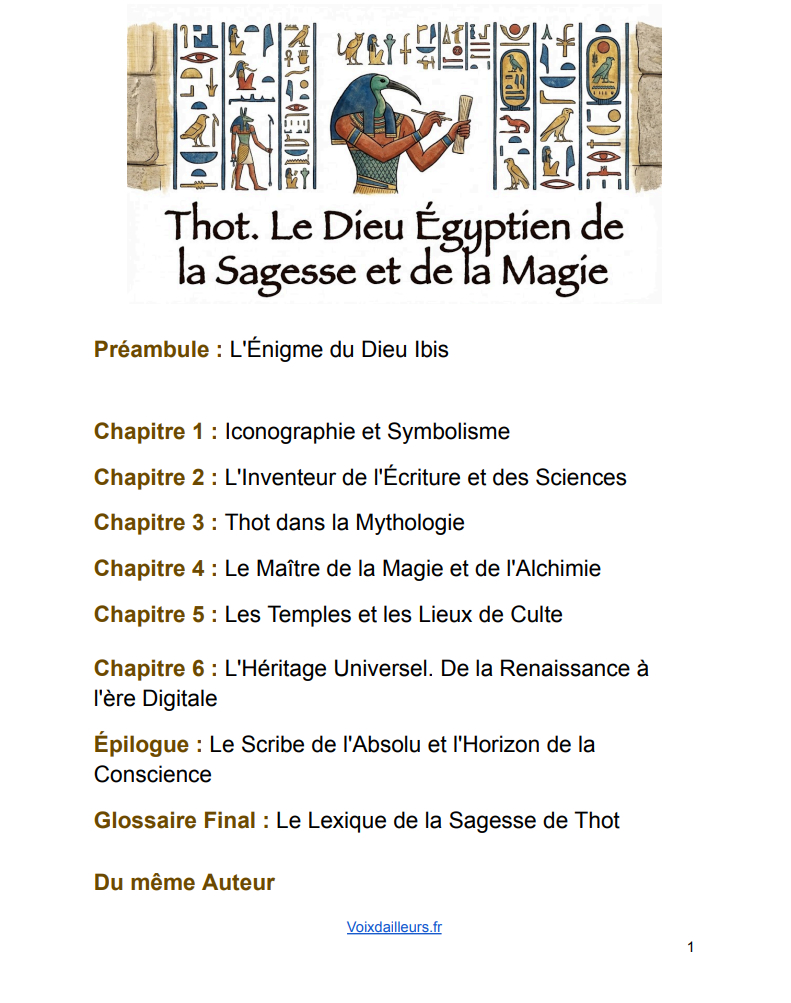Plongez au cœur de l'Égypte antique avec cet e-book fascinant dédié à Thot, l'architecte invisible de la civilisation pharaonique. Bien plus qu'une simple divinité, il incarne l'esprit souverain qui transforme le chaos originel en un cosmos parfaitement ordonné.