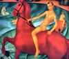 Kuzma Sergeyevich Petrov-Vodkin (24 October 1878, Khvalynsk – 15 February 1939, Leningrad) was a Russian painter and writer, teacher and graphic artist. In the variety of European and Russian artistic movements of the early XX century, Petrov-Vodkin found similar ideas, but always adhered to his own pictorial manner. He is a lone artist, a cosmopolitan and an eternal tramp who searched for universal meanings in every nation, in its traditions and directions of development.Kuzma Petrov-Vodkin is a man of the earth. Stepping firmly and growing into the ground with his steps, he felt a connection to it. In the African deserts and on the viscous ashes of Vesuvius, on the Breton forests and dusty roads of Samarkand, he laid with his feet invisible, winding lines, stitching together the universal truth, once lost, divided into national features and traditions.