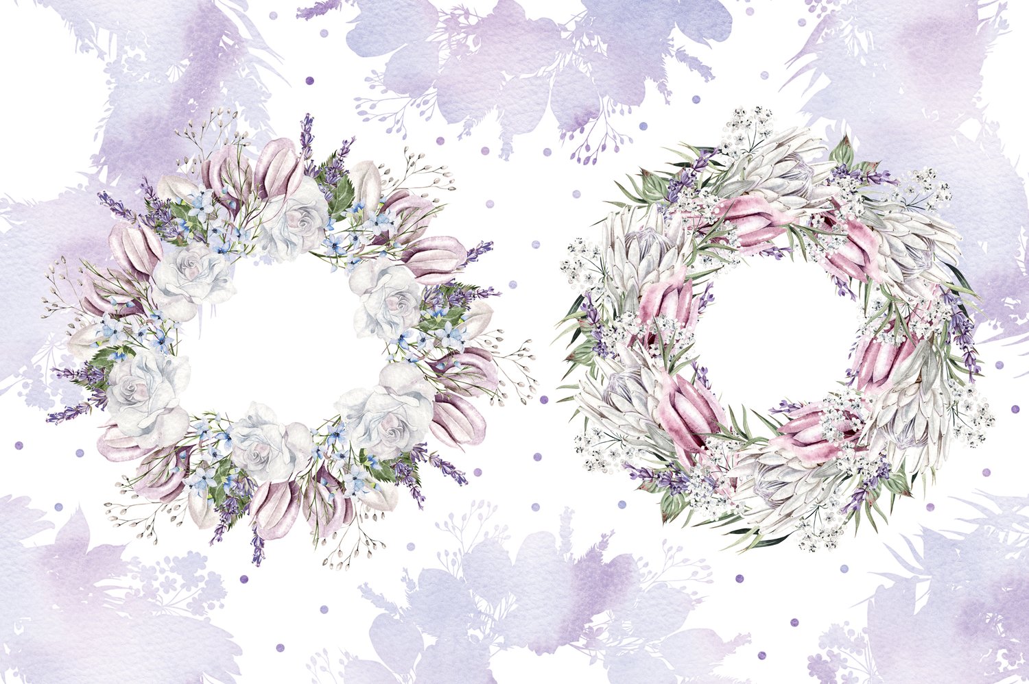 This watercolor set consists of 90 watercolor PNG elements. They include patterns, bouquets, wreaths, elements separately and cards. Delicate watercolor roses and protea, lavender, leaves and buds.
