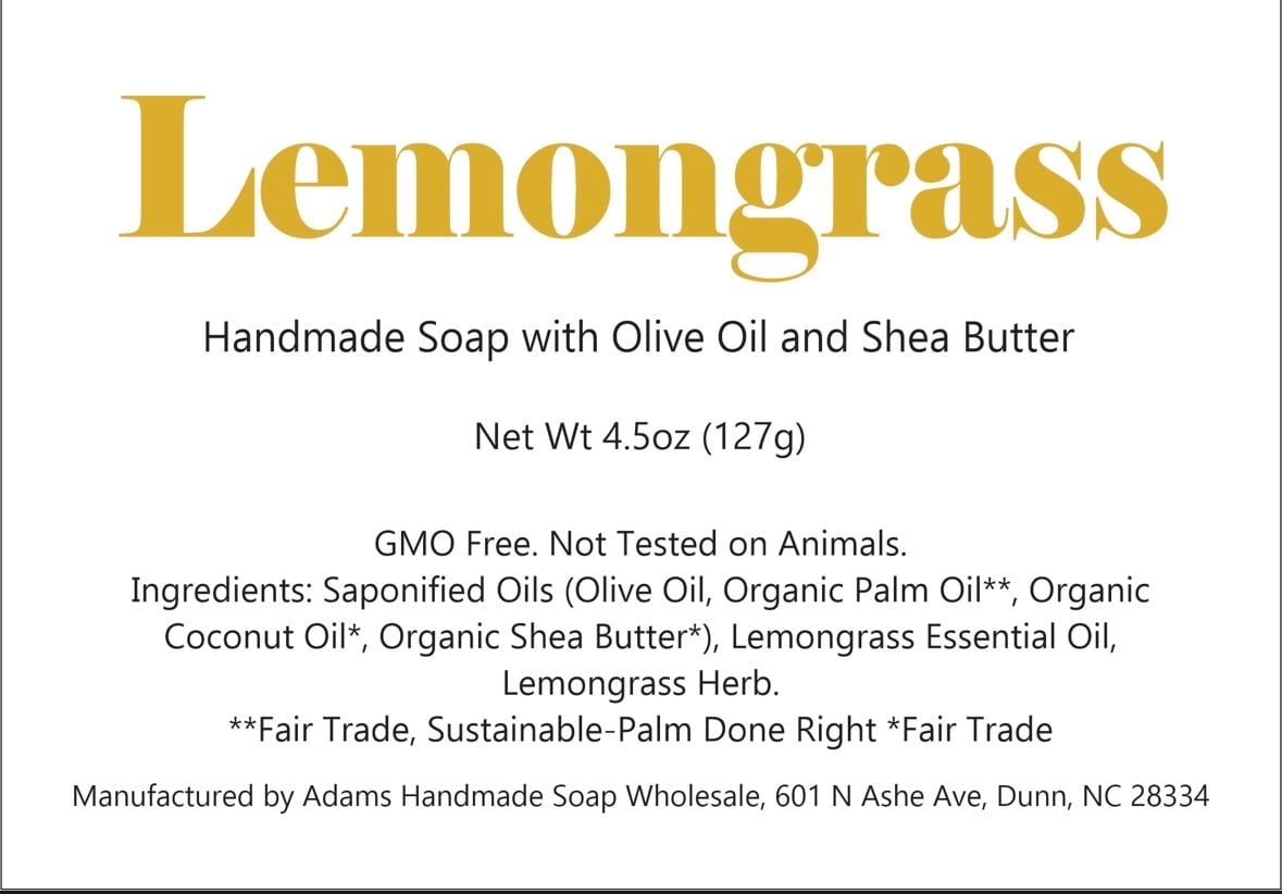Ingredients: Saponified Oils (Olive Oil, Organic Palm Oil**, Organic Coconut Oil*, Organic Shea Butter*), Lemongrass Essential Oil, Lemongrass Herb. **Fair Trade, Sustainable-Palm Done Right, *Fair Trade