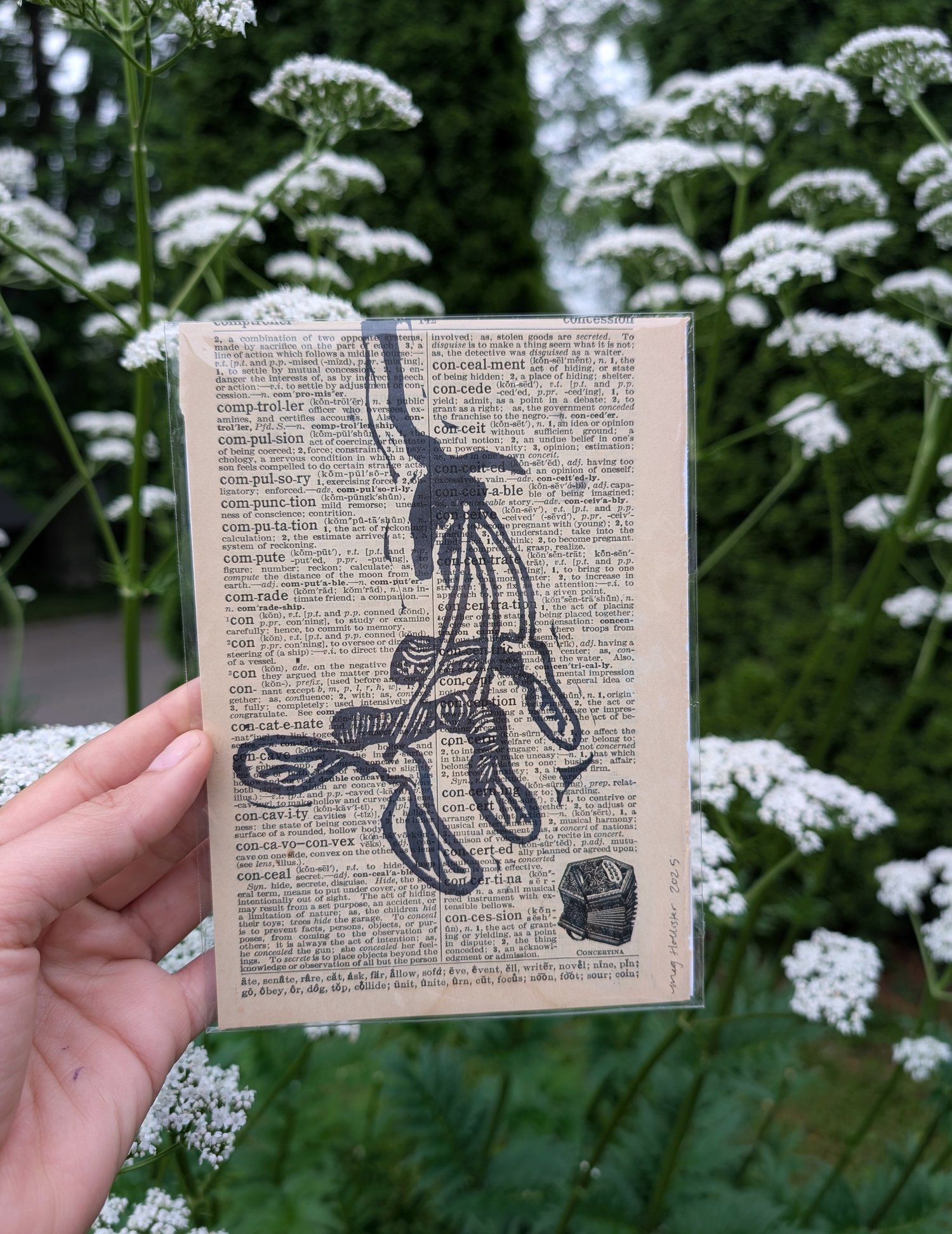 5x7 inch hand illustrated linocut print on vintage illustrated dictionary pages. These pieces are truly one of a kind- due to the nature of book pages and the nature of linocut prints, each print is going to look a bit different and feature slightly different book page illustrations.