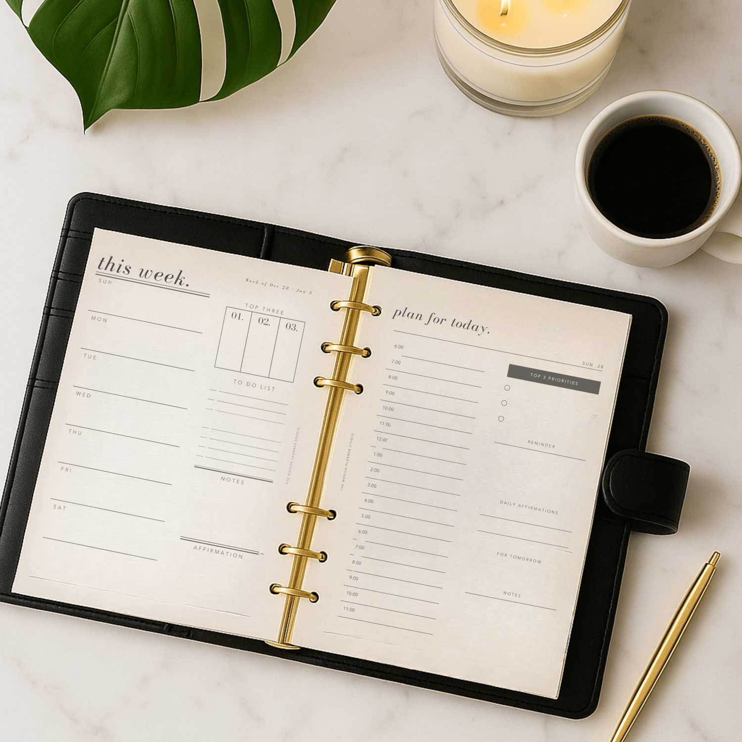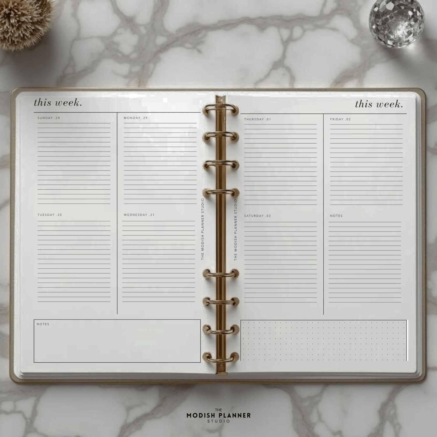- Double-page monthly+weekly spreads