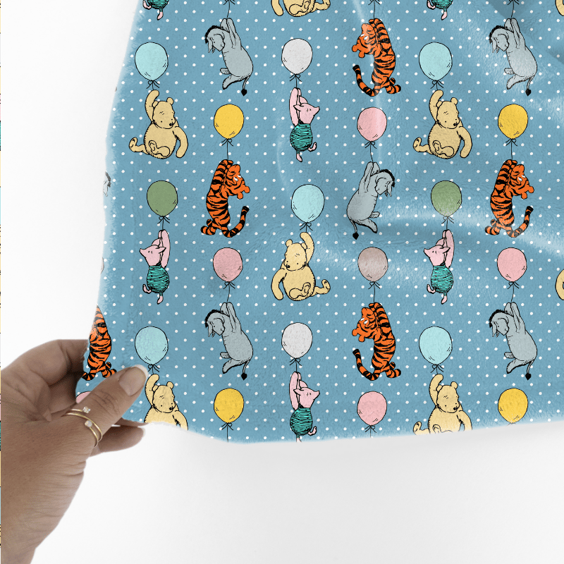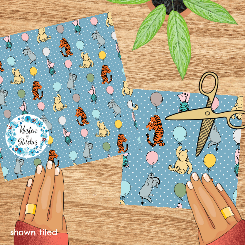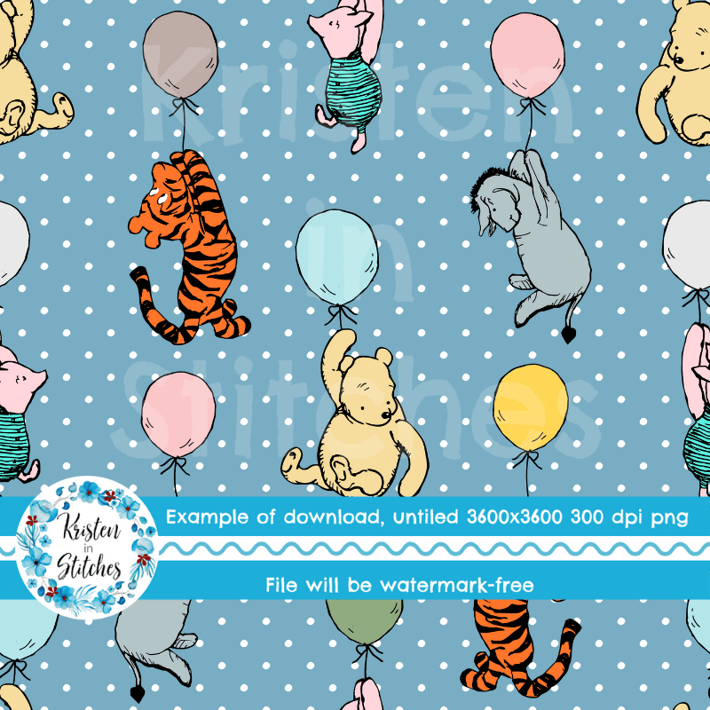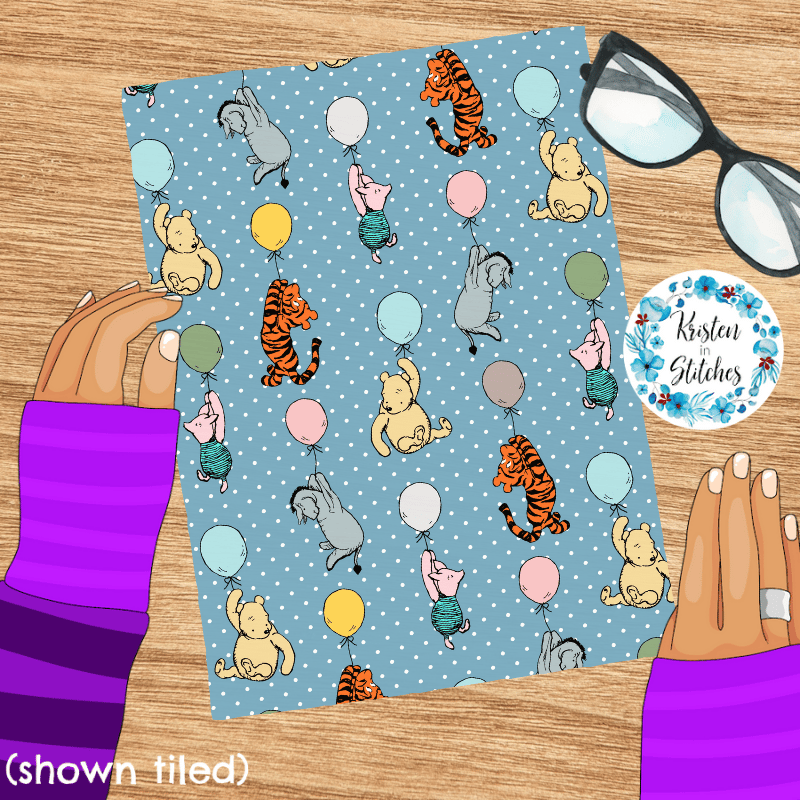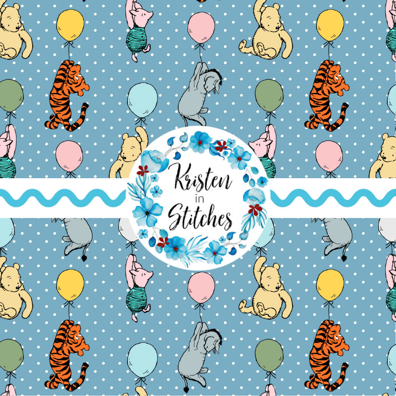 Classic Winnie the Pooh and Friends Floating Balloons Nursery Seamless Pattern, Country Blue