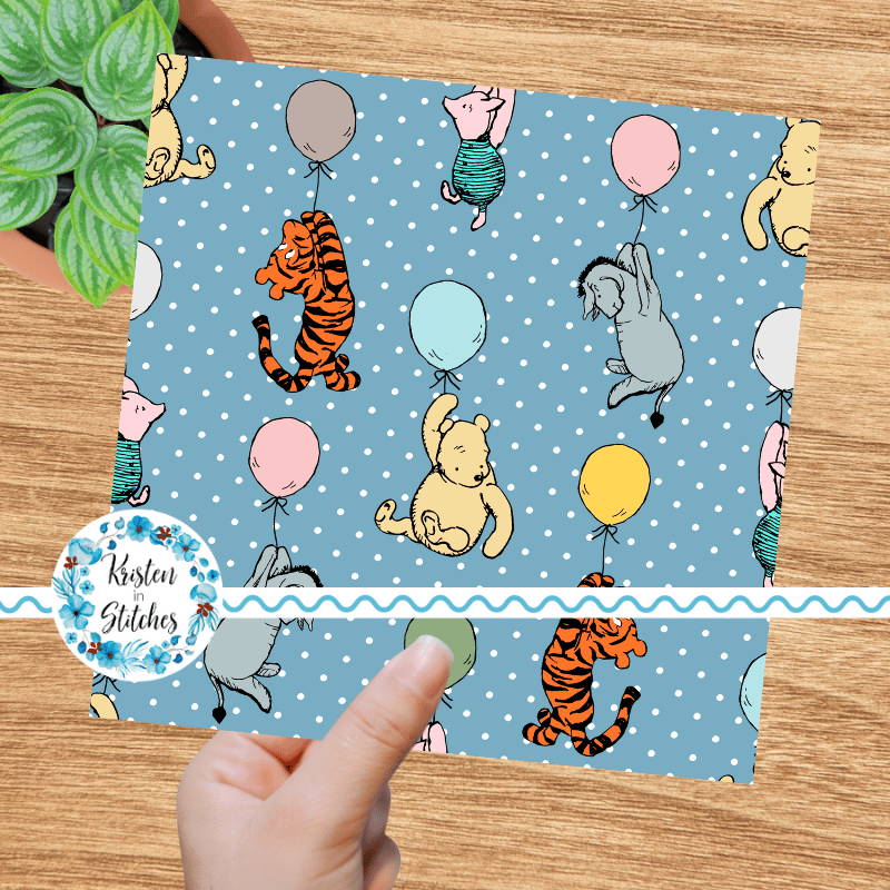 Classic Pooh storybook characters with floating balloons, including Eeyore, Tigger and Piglet.