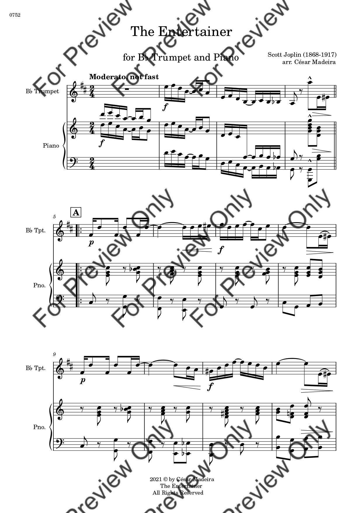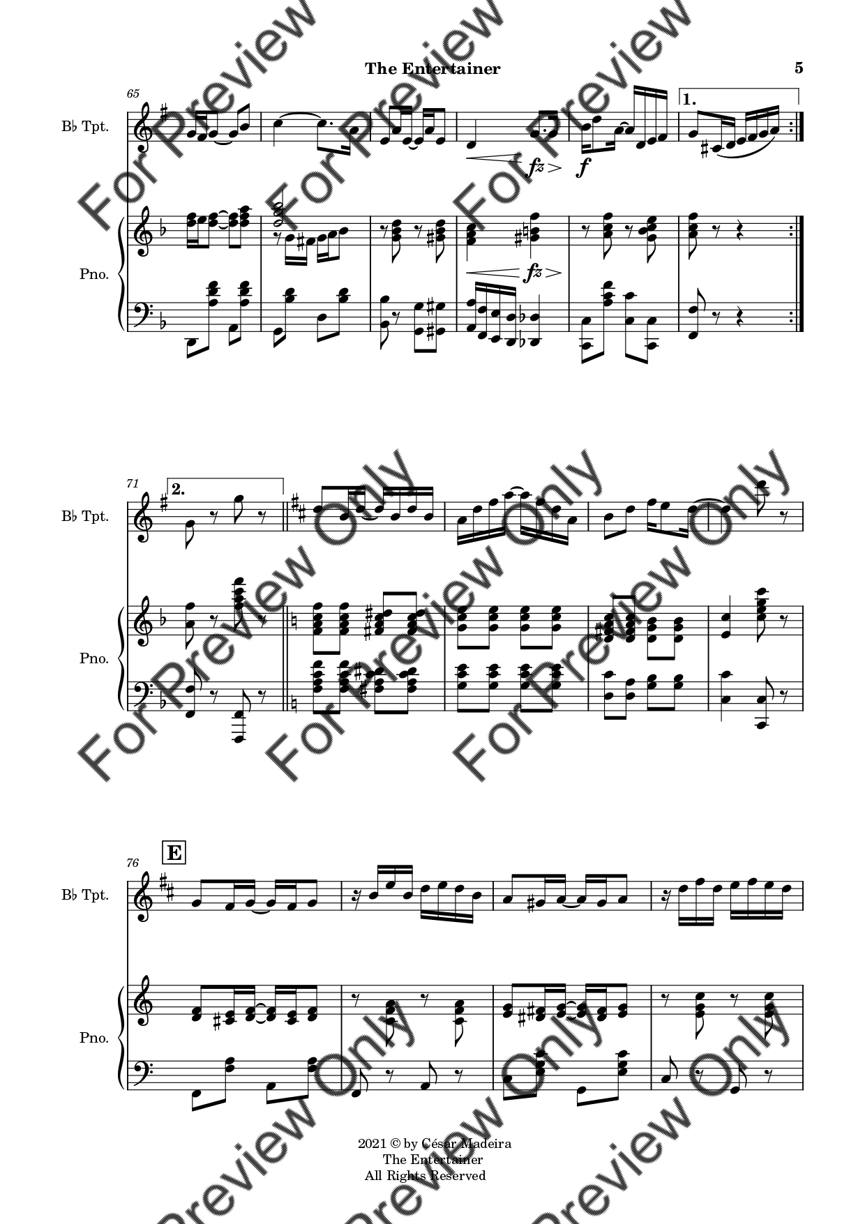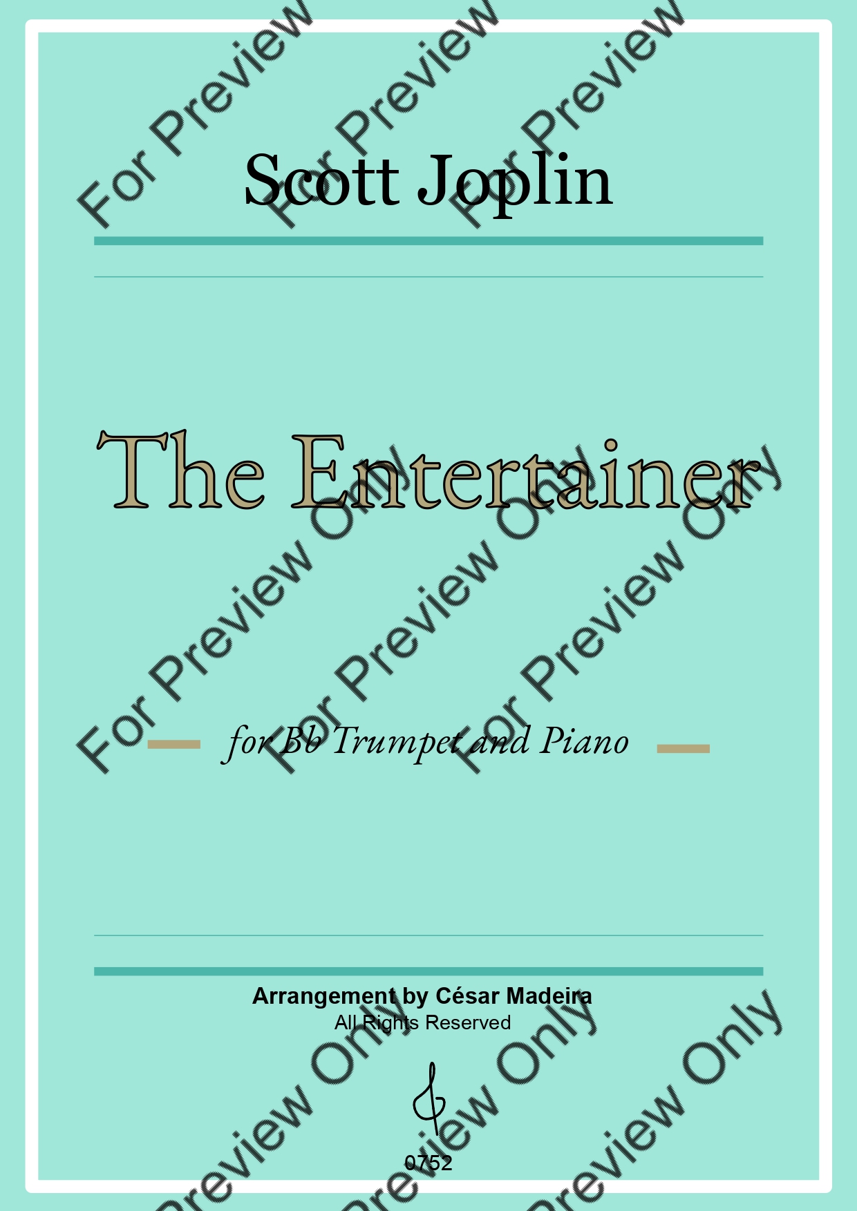 The Entertainer by Scott Joplin. Arrangement for Bb Trumpet and Piano. With Full Score and Individual Parts. Have fun!