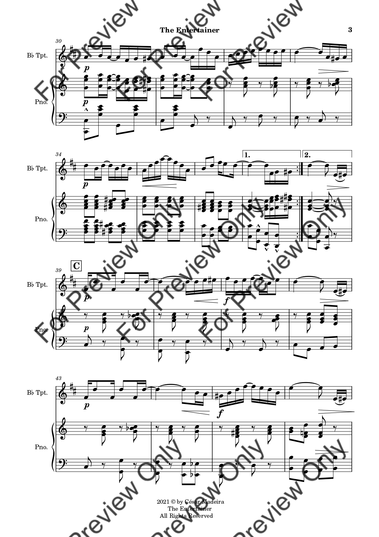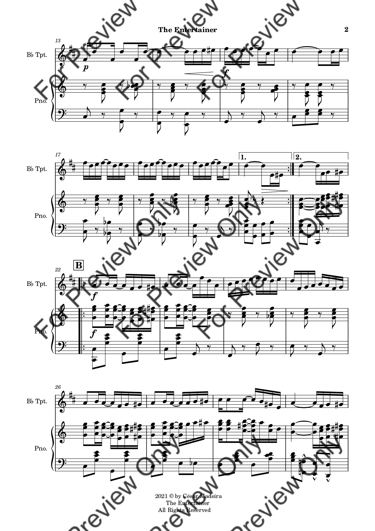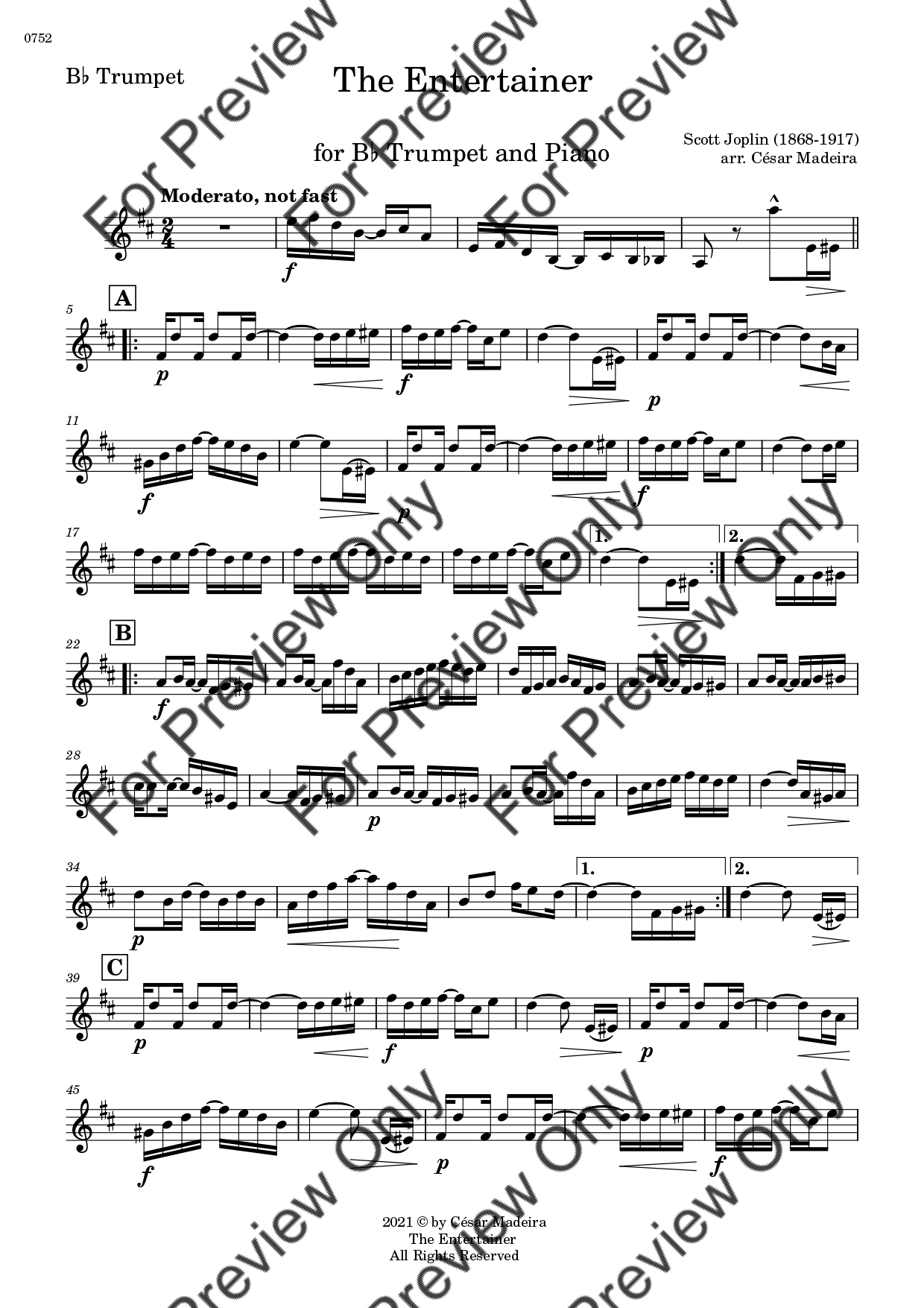 The Entertainer by Scott Joplin. Arrangement for Bb Trumpet and Piano. With Full Score and Individual Parts. Have fun!
