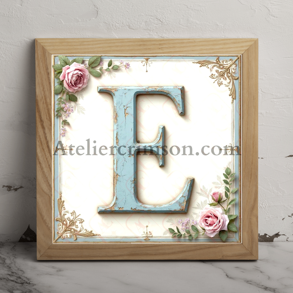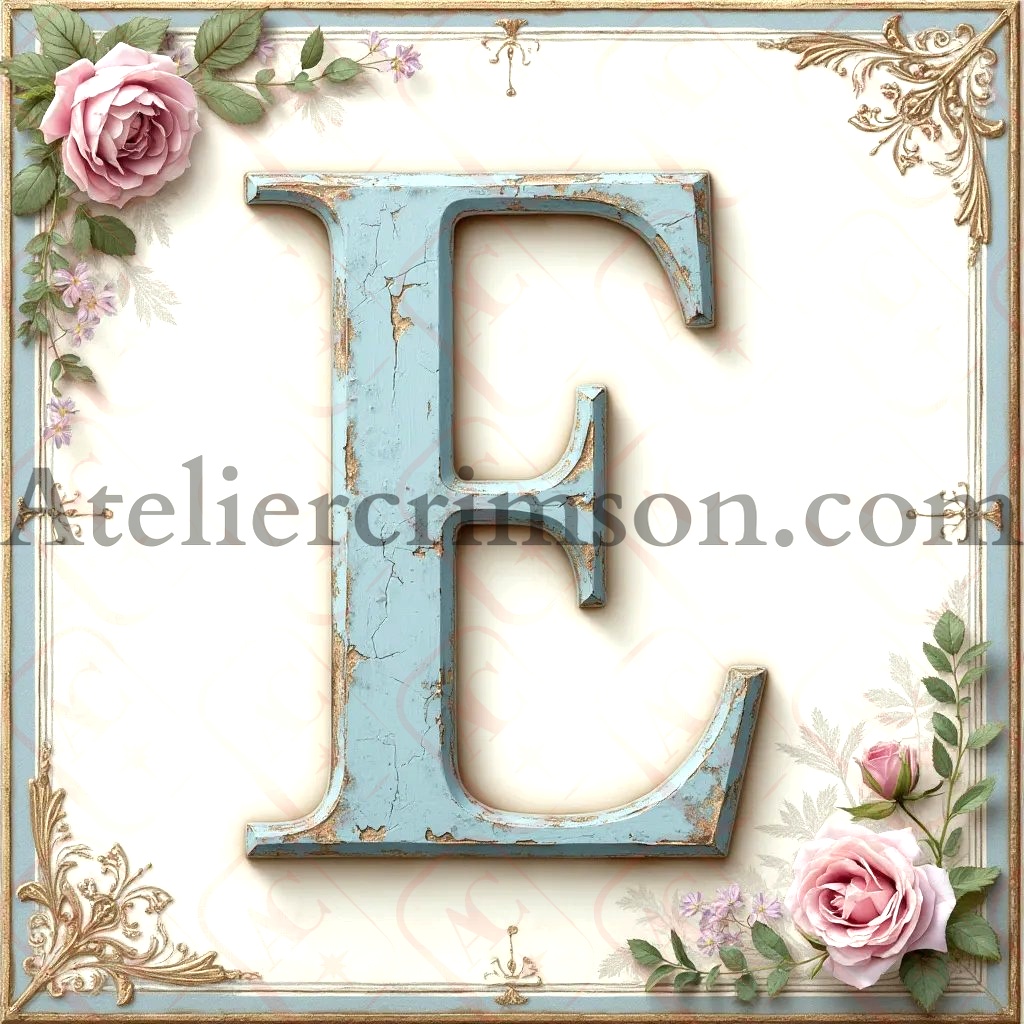 The letter E shabby chic blue a work of art in soft pastel blue. These elegant characters, reminiscent of weathered painted wood, stand out against a delicate off-white background with subtle floral accents. Perfect for vintage-inspired home decor, DIY projects, or creating unique, personalized gifts with a touch of timeless elegance.