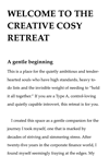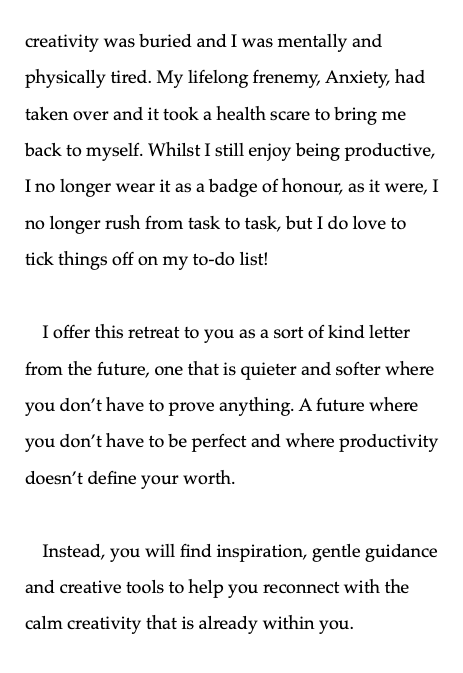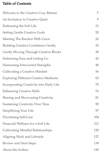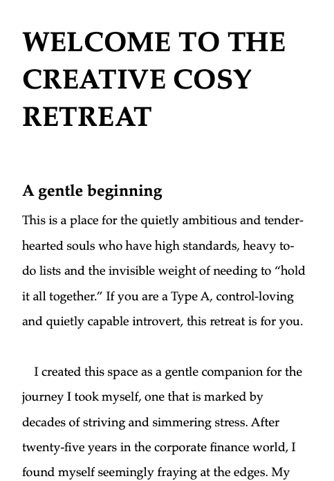This self-guided book retreat is designed for Type A control-loving introverts, deep thinkers, and quietly ambitious souls who want to soften the edges of modern life. Creative Cosy Retreat invites you to slow down, listen inward, and explore your creative life through a gentle, structured path.