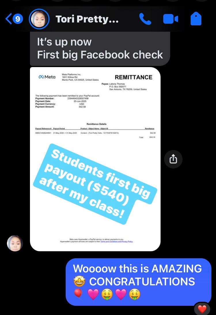 Ive been making $4500-$8500 a month from FB for YEARS. Now, help people get monetized FAST and teach everything you need to know to REALLY make THOUSANDS easily + consistently from FB! I break it all down step by step in an easy to understand and copy manner.