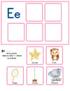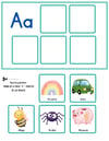 Cada página presenta una vocal en mayúscula y minúscula junto con tarjetas ilustradas de palabras que comienzan con esa vocal, permitiendo asociar la letra con su sonido y con imágenes significativas.