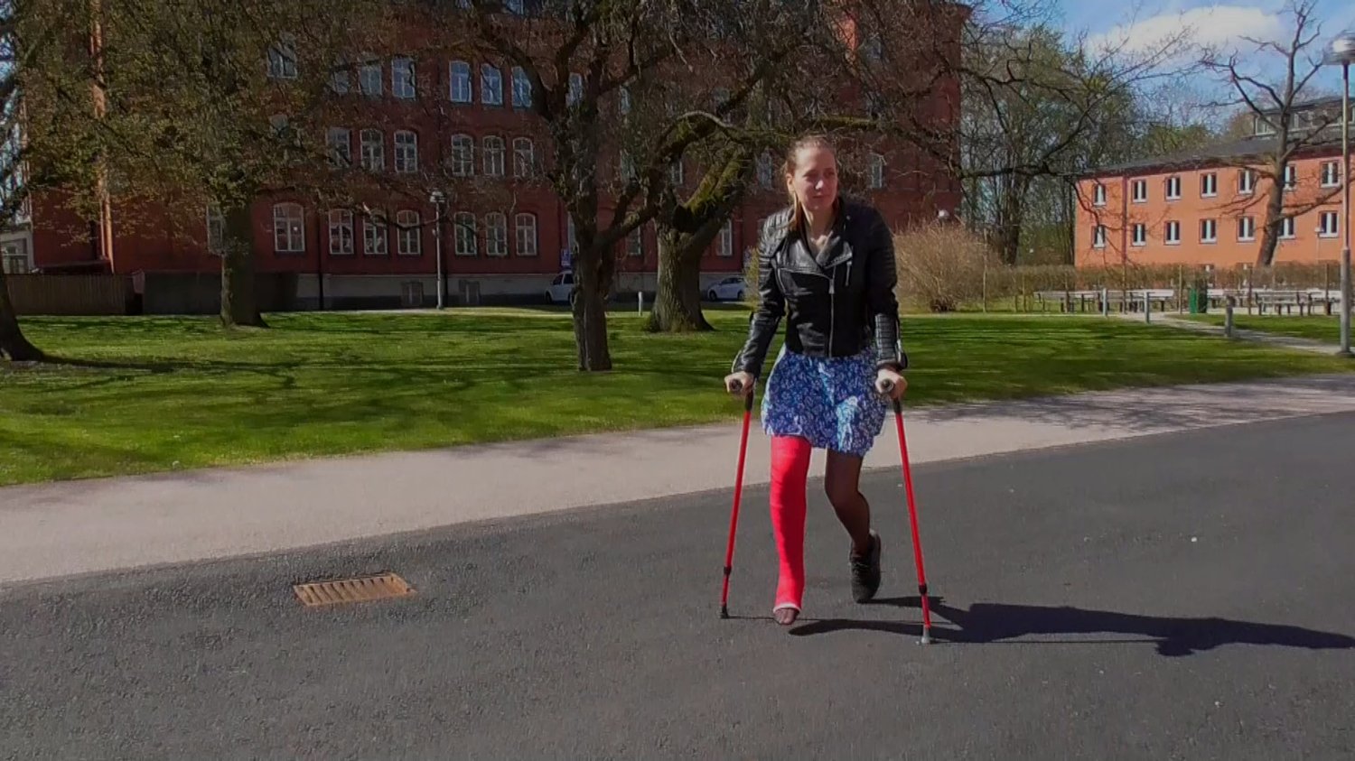Sunshine is casted in a red LLC in this amazing clip containing mostly hot closeups, she’s wearing a nice skirt and thin black nylons. As you can see, she’s sitting outside but the plan is to slowly get herself back to the car again. As the clip goes by, the cameraman accidentally (or intentionally?) bumped in to Sunshine’s casted leg twice. It hurts her, but her kind soul keeps saying that it’s okay. More closeups are being filmed in the car, have a nice look of her nicely white painted toes.