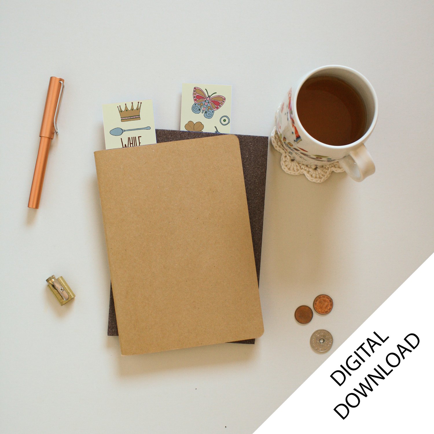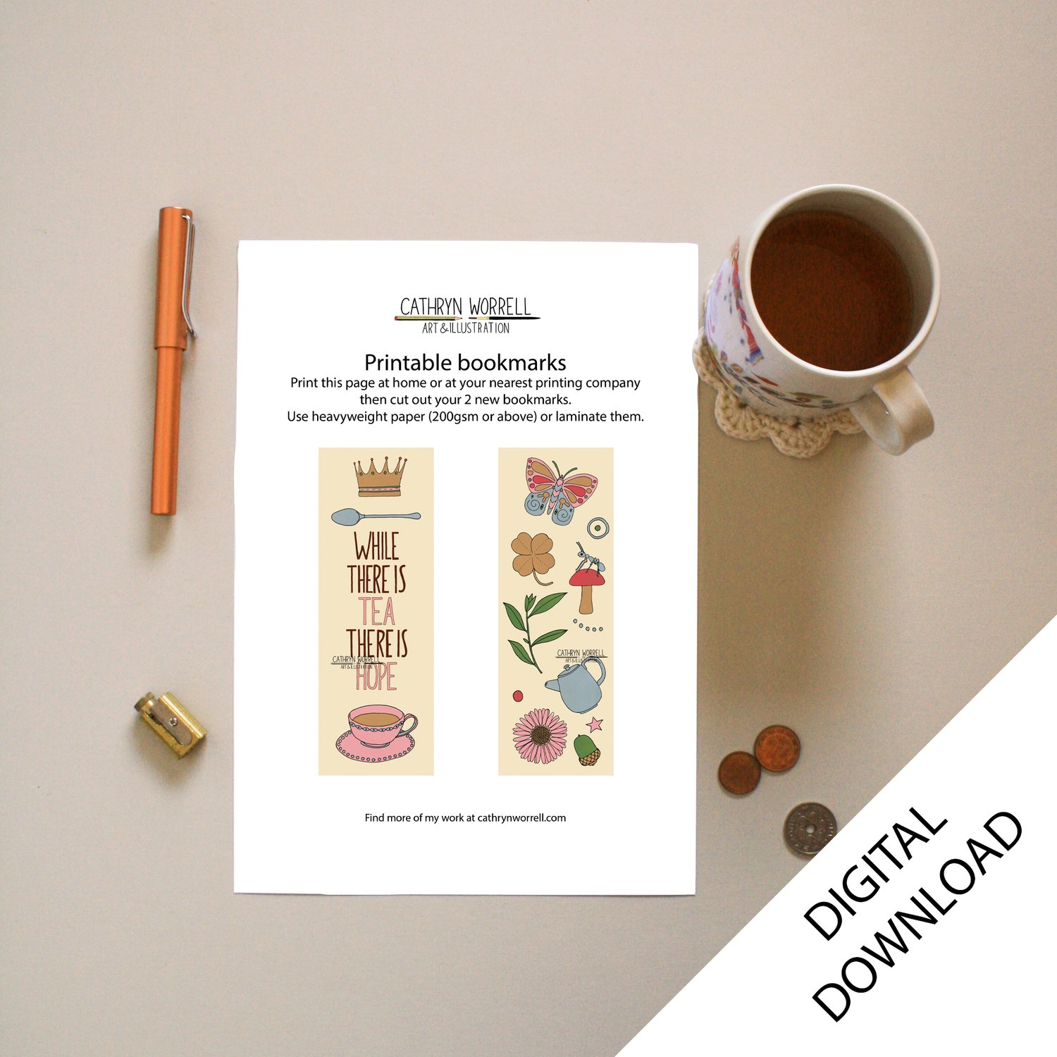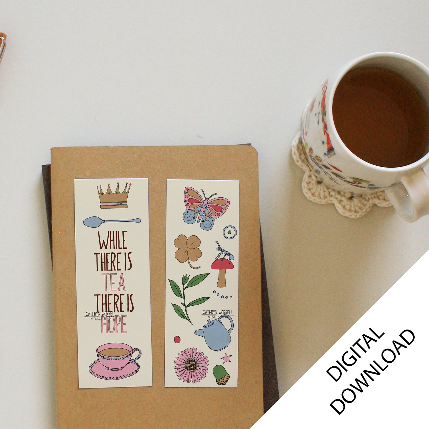 This set of 2 bookmarks feature my hand drawn illustrations of a teacup, teapot and symbols related to tea leaf reading, plus a hand lettered quotation. Print out the file on thick paper or card and cut out each bookmark.