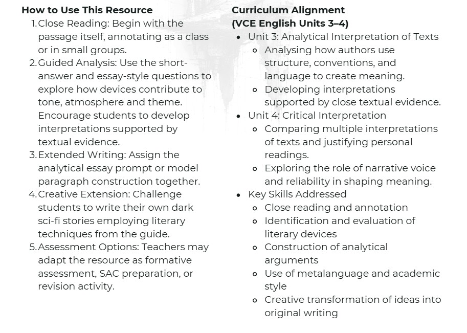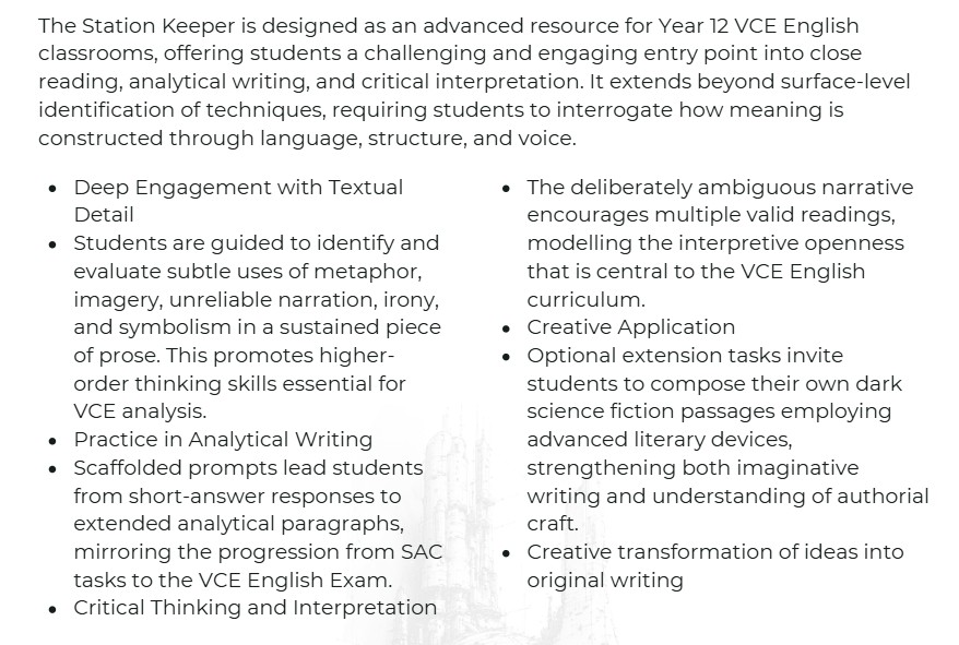 Dive deep into dark science fiction with this Year 12-ready resource! The Station Keeper challenges students to analyse complex narrative, language and literary techniques while building critical thinking, close-reading and analytical writing skills.