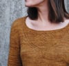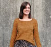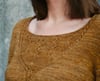 This garment is worked top-down, with a modified Ziggurat construction - as developed by Åsa Tricosa - for the yoke. Back and shoulder stitches are cast on first, and short row shaping is worked to shape the back of neck and slope the shoulders. Stitches are picked up around the end of the shoulders and along the front to form the front shoulders and start of the sleeves; further short row shaping is worked to slope the front shoulders. The neckhole is shaped before stitches are cast on at the front to form the neckhole and join in the round. The front of the garment features cablework. Once the cablework is completed and the yoke has been separated into body and sleeves, each are worked in stockinette, in the round, to desired length. Waistband and cuffs are finished with half-twisted ribbing; the neckhole is finished with an I-Cord neckband.