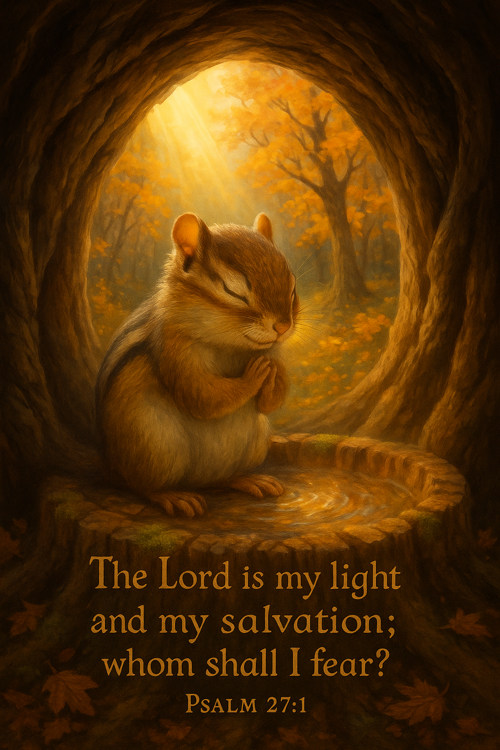 Celebrate divine protection with this Christian wall art featuring Psalm 27:1. Designed with a serene woodland scene, a prayerful chipmunk nestled in a hollow tree, and warm golden light, this printable affirms that the Lord is our light and salvation—therefore, we need not fear. Perfect for devotional spaces, children’s ministry, and healing gifts.