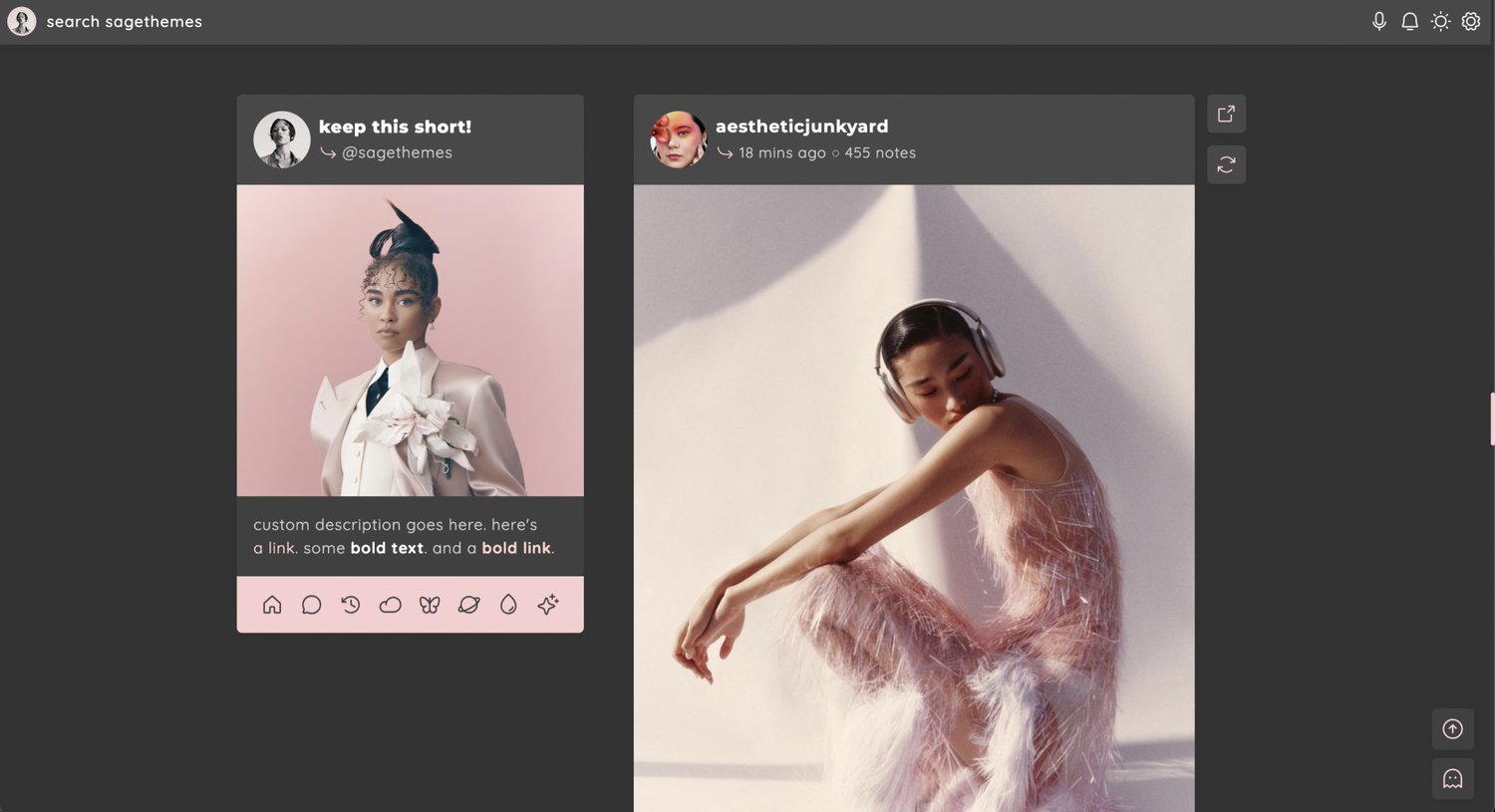 - headerbar includes blog icon/home link & search bar | (optional) music player & updates buttons | day/night & tumblr controls buttons