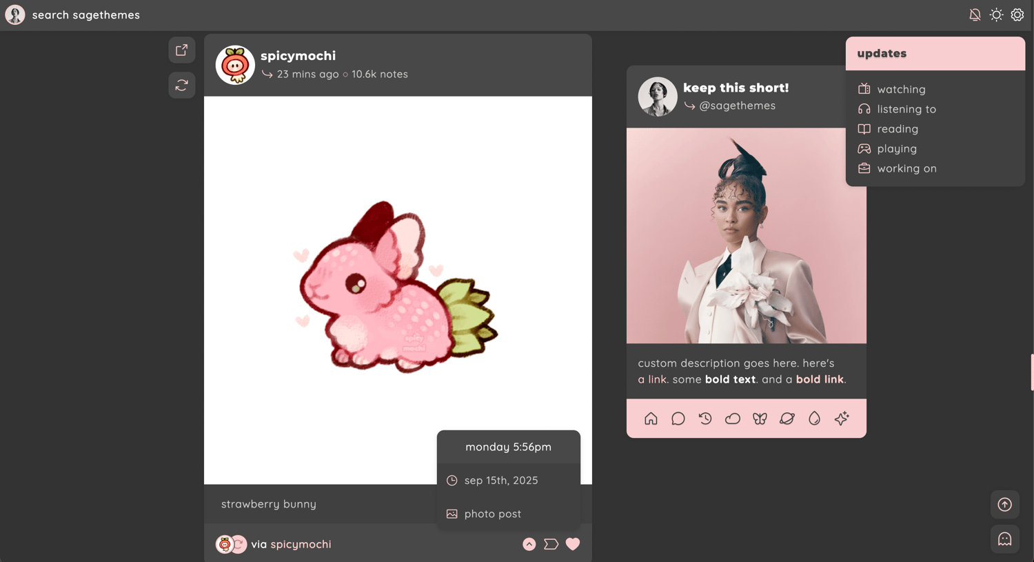 - toggle: tags on click, music player, updates, right or left sidebar