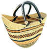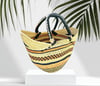 The beautifully handcrafted Gurune Grace Woven Basket. It’s a functional piece of art, featuring a blend of natural straw hues with vibrant black and orange patterns. The basket’s design includes two durable handles for easy carrying, making it ideal for both practical use and as a decorative item in any setting. Its intricate weaving and bold color contrast give it a unique charm that reflects skilled craftsmanship. Such baskets are often associated with cultural significance and can be found in various styles and sizes, each telling a story of tradition and community
