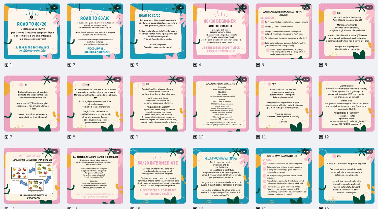 ➡️Ogni livello propone step settimanali chiari, come introdurre acqua e limone al mattino, aumentare frutta e verdura crude, sperimentare giorni veg, provare colazioni a base di frutta, inserire frullati ed estratti, fino ad arrivare all’approccio 80/20 vero e proprio.