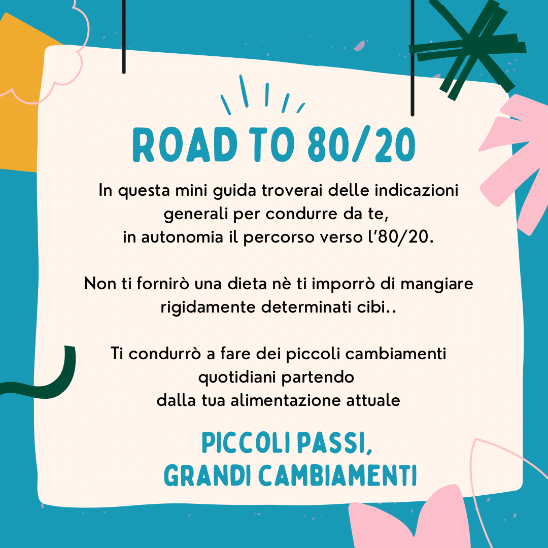 “Road to 80/20” è una guida pratica e motivante che ti accompagna passo dopo passo verso un’alimentazione più sana, leggera e consapevole, senza estremismi e senza rinunce forzate.