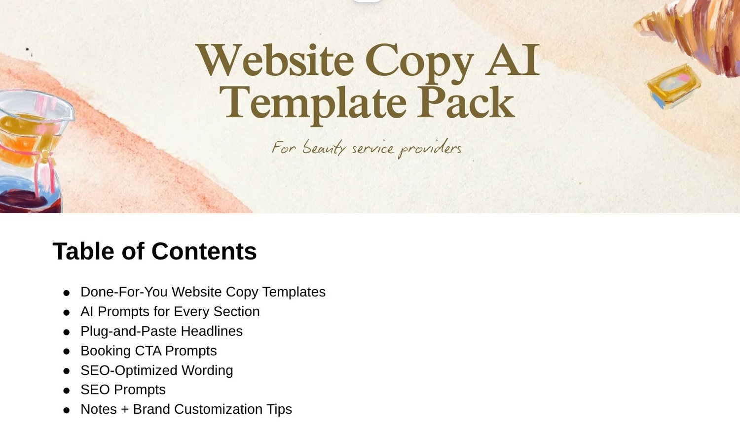 This pack gives you complete, ready-to-use website wording along with AI prompts that help you customize it to your brand voice.