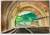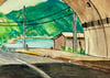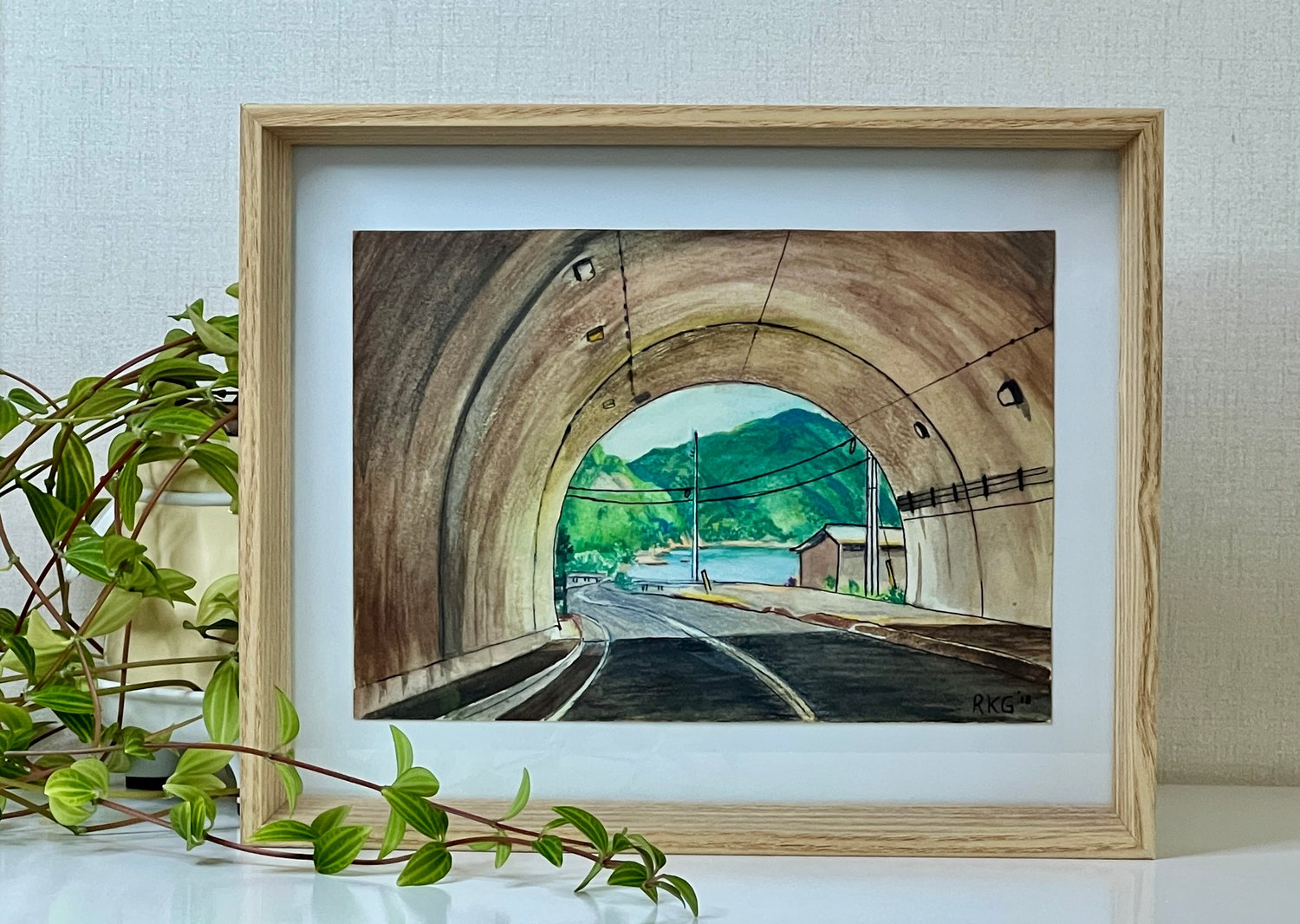 Weaving down the curving Tobishima Kaido road off the coast of Kure in Hiroshima, hopping from island to island, crossing bridge after bridge over the Seto Inland Sea, you get to see some of the absolute best of Japan. These old concrete tunnels are common throughout Hiroshima, and seeing one open up to the glittering crystal-blue sea compelled me to take a snapshot and make a painting out of it. This watercolor painting conveys the adventure and incomparable beauty of that trip along that island chain drenched in the fragrance of orange and paulownia blossoms.