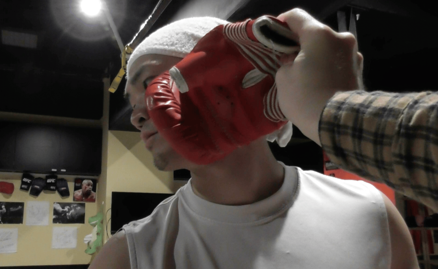 Daiki is practicing boxing when timestopped. He is frozen several times while punching a punching bag, put on the floor like a mannequin and timestopped while punching at the camera.