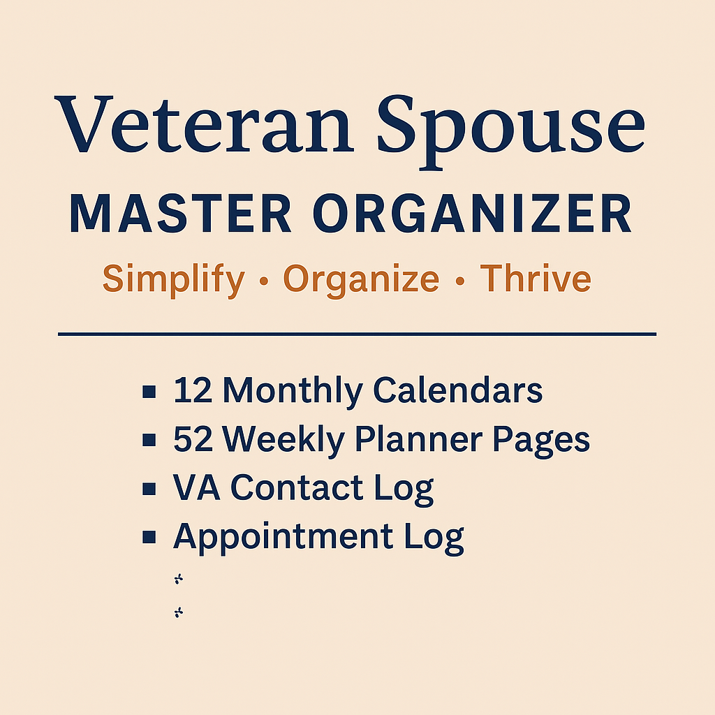 Life as a veteran spouse can be overwhelming—appointments, VA calls, finances, chores, and meals all demand your attention. The Veteran Spouse Master Organizer keeps everything in one easy-to-manage place so you can stay in control and stress less. Organize your home, streamline your schedule, and free up time for what matters most.