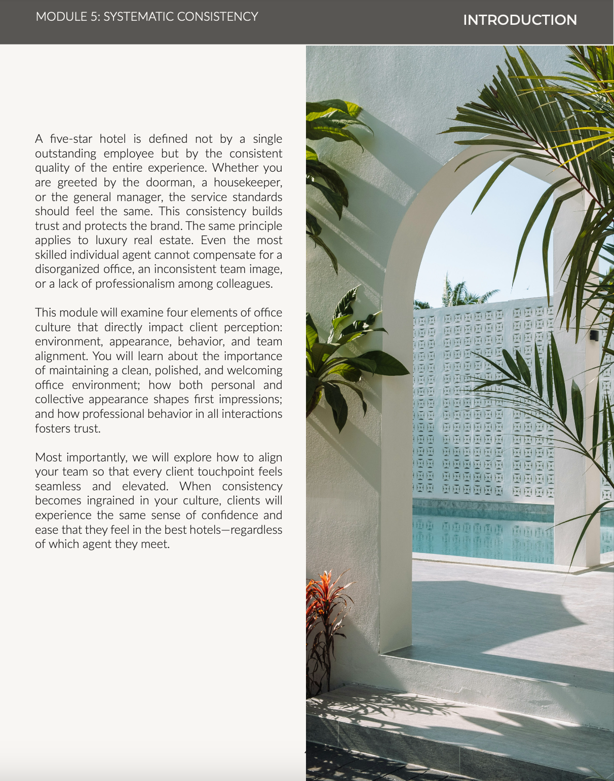 In luxury, inconsistency erodes trust. This module shows you how to create alignment across your own communication, team, and partners so that every client touchpoint reflects the same elevated standard.