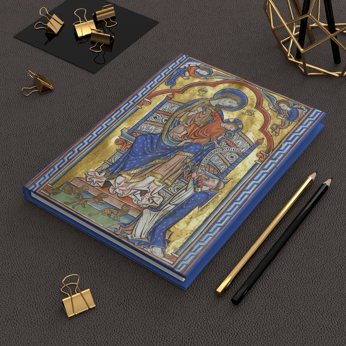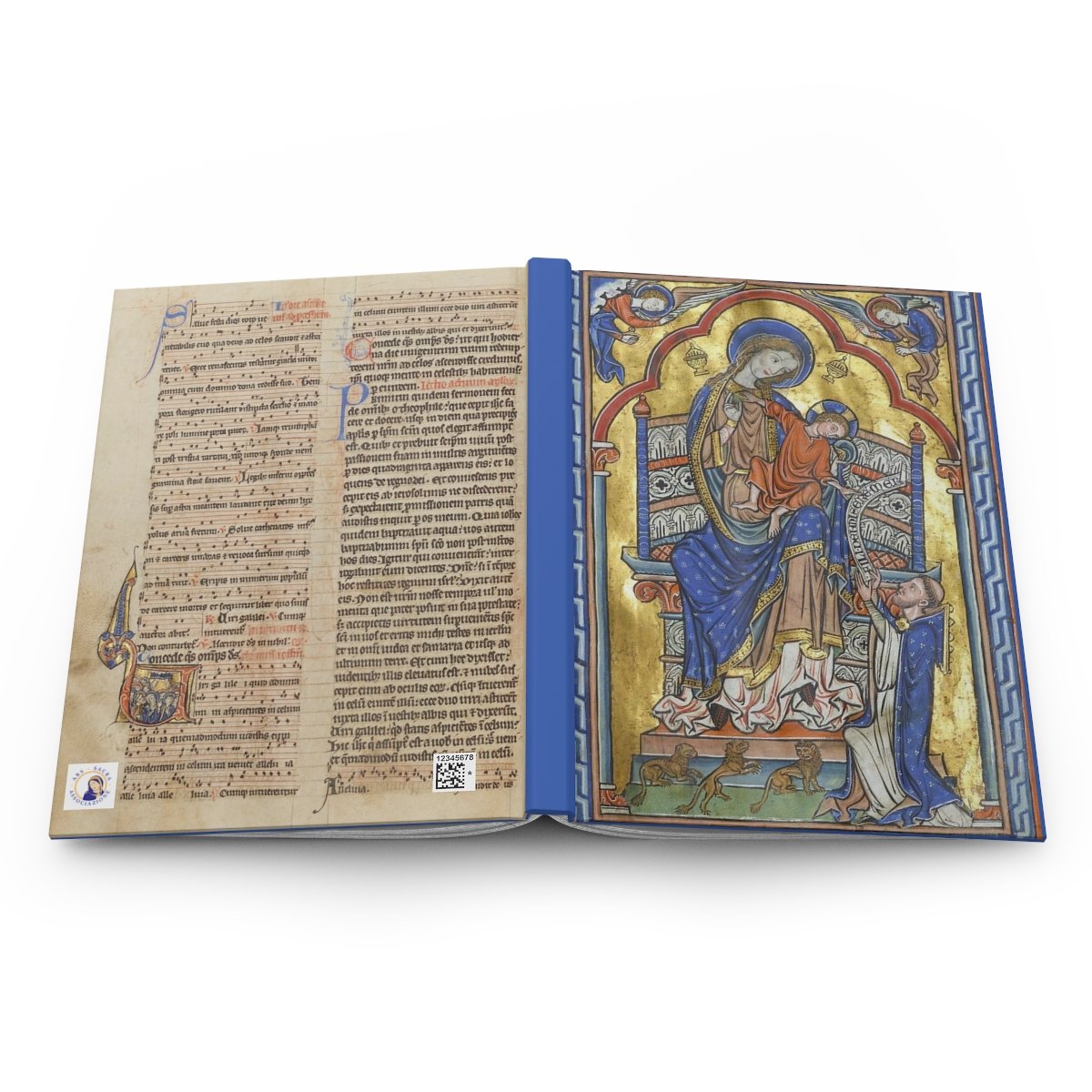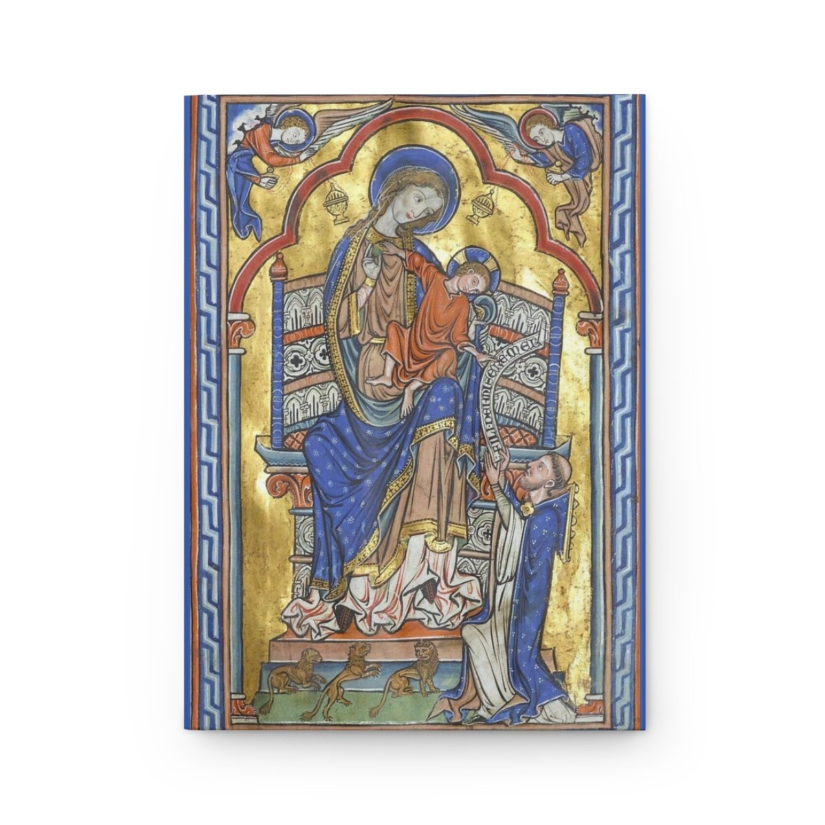 This journal features a full-page illumination from a 13th-century Sarum Missal, one of the great surviving liturgical treasures of the English Middle Ages.The Virgin and Child enthroned as Sedes Sapientiae, the Throne of Wisdom. Set against a gold ground and framed by rich Marian blue, the image presents Mary as the living throne of the Incarnate Word. A kneeling cleric at her feet is in adoration. The back cover reproduces a page from the Mass for Pentecost.