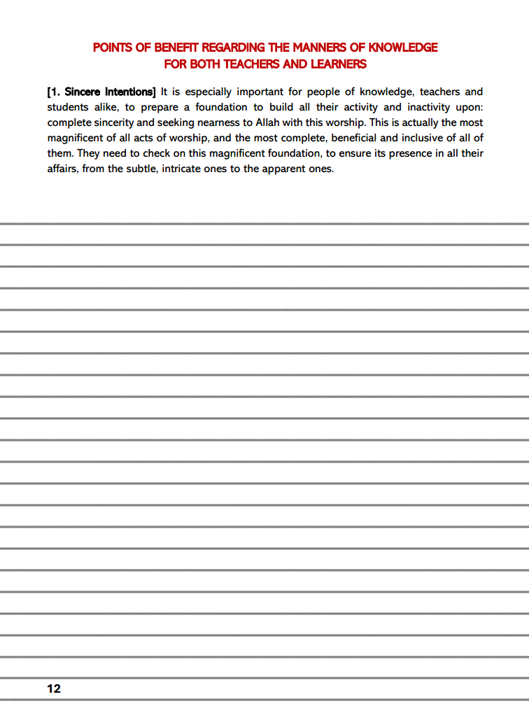 In this workbook, you will find the entire text along with ample space for note taking during classes. The 21 main points and their headings are actually from Shaykh ‘Abdus-Salaam ibn Burjis (may Allah have Mercy on him), where he included this text at the back end of his tremendous book, ‘Awaa’iq at-Talab, adding the headings for clarity. That book was translated into English by our brother, Ustaadh Qaasim Mutiva (may Allah preserve him and enable him to aid his brothers and sisters in the best ways), under the English title, Obstacles in the Path of Seeking Knowledge.