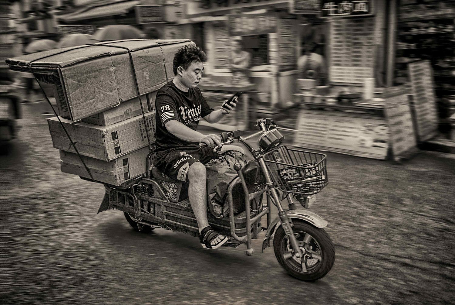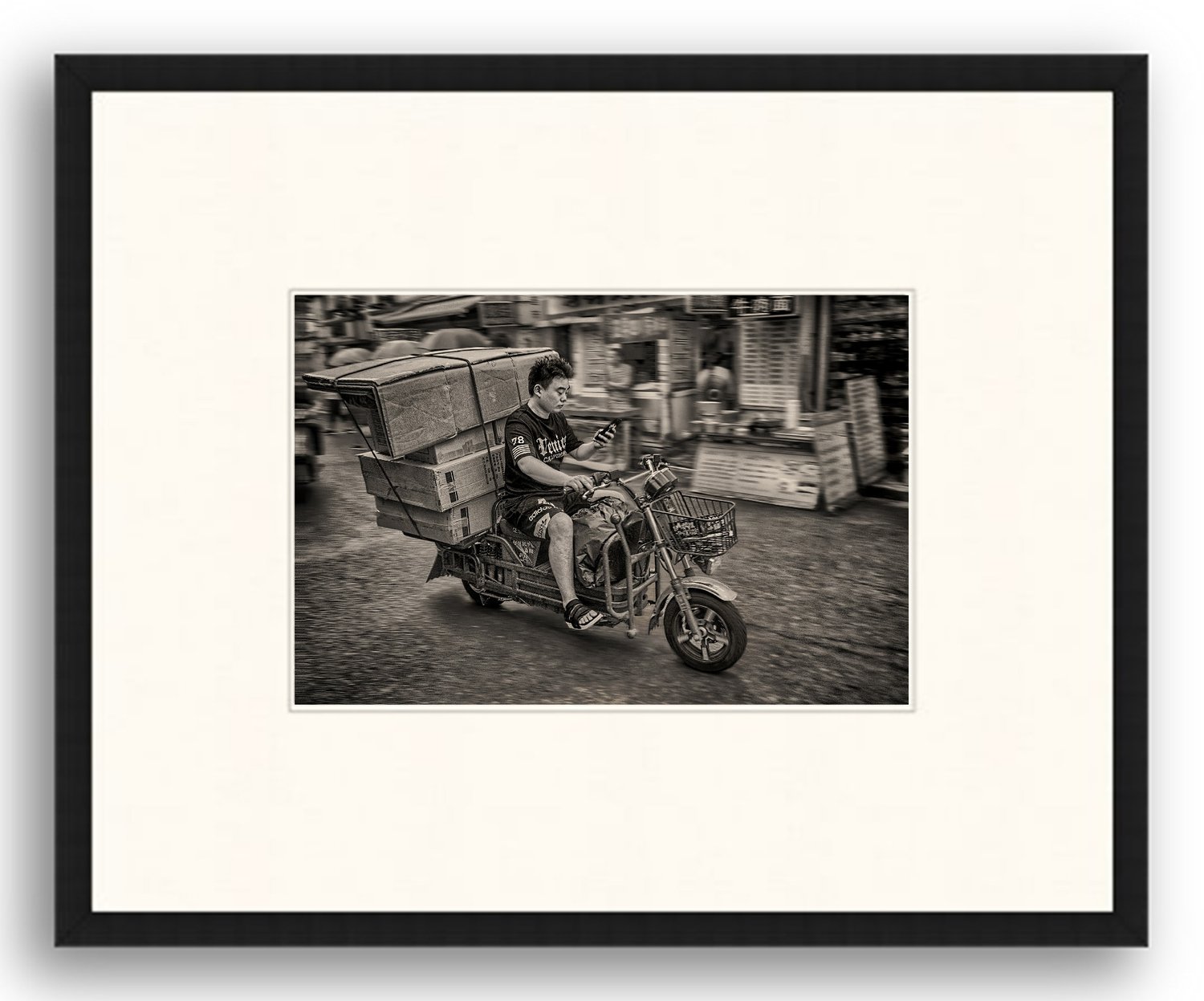 - Notes from the Artist: Captured in an instant on the streets of Old Shanghai, China. The assembled shopping crowds parted abruptly as the quickly moving scooter appeared with the driver never looking up from his modern technology. The scooter loaded beyond belief with a load of recyclable materials. The image exemplifies the mixture of culture, technology, ecology and transportation deep in the midst of one of the worlds oldest cities.