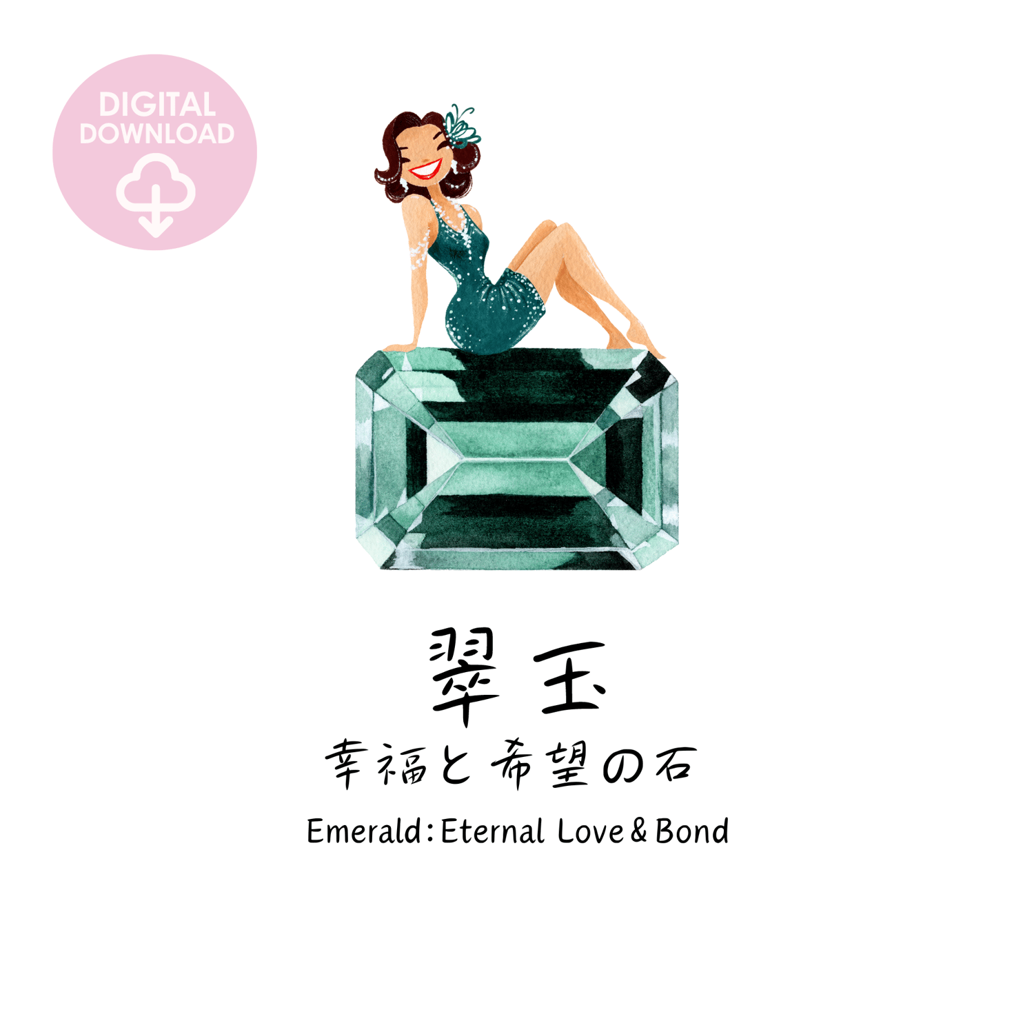 Celebrate May birthdays with my elegant printable wall art featuring a chic woman and a shimmering green emerald. This piece includes a quote about the emerald in English and Japanese, combining beauty with cultural depth. Print it at your convenience and enjoy a piece that adds both style and significance to your decor.