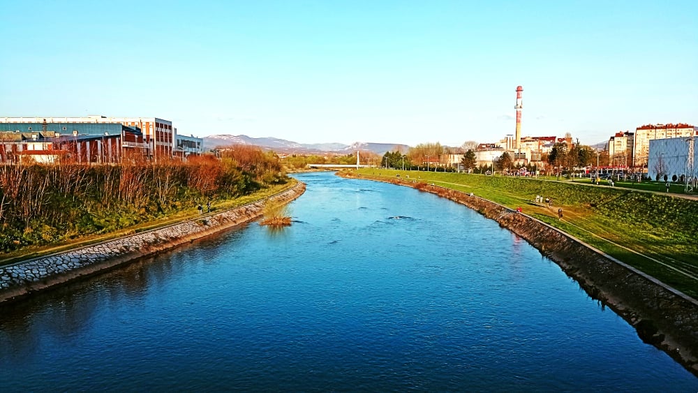 This captivating photograph highlights a vibrant cityscape where a majestic river flows through the heart of the urban environment. The river meanders gracefully on both sides of the city, with people leisurely strolling along the city quay.