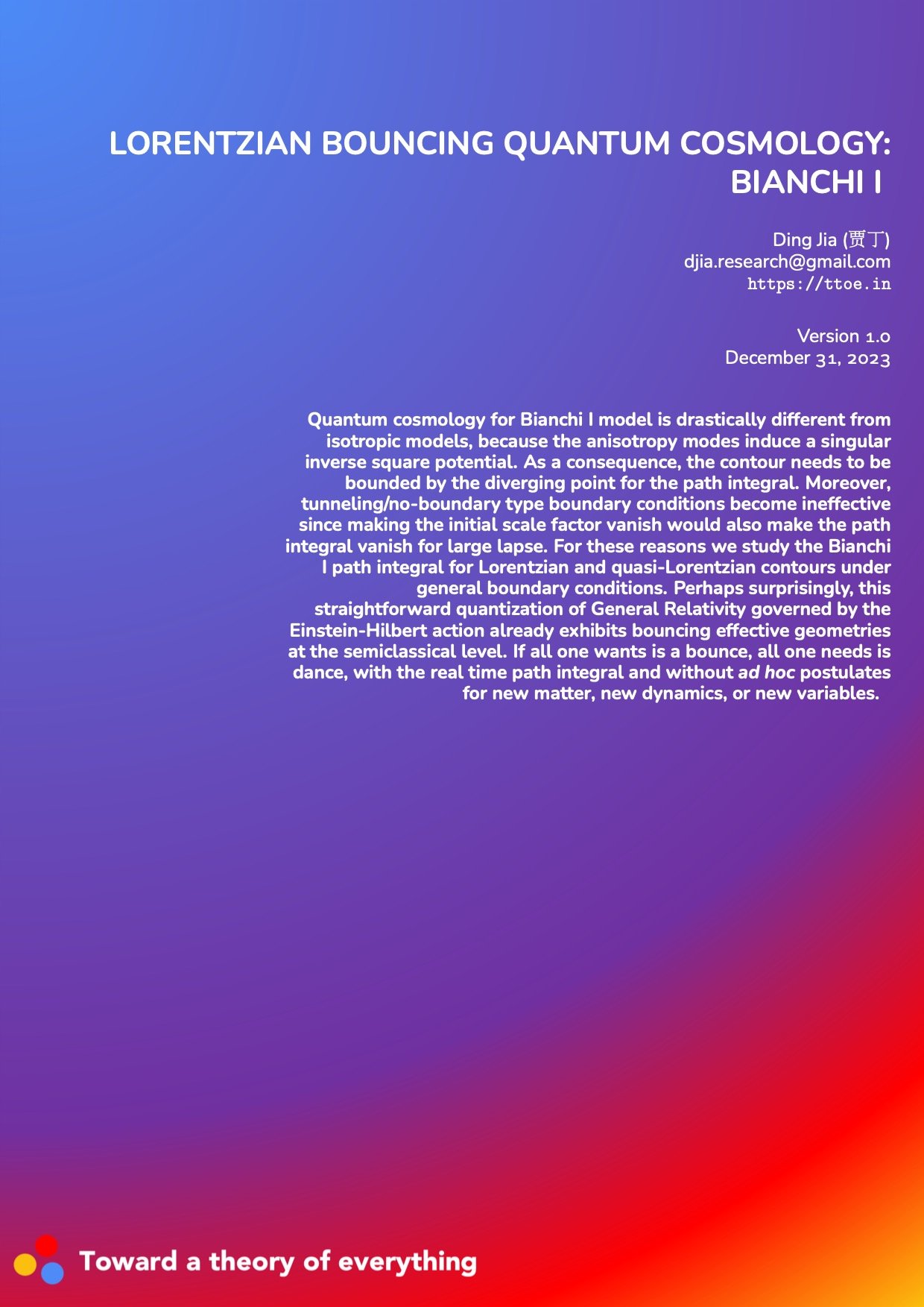 Abstract: Quantum cosmology for Bianchi I model is drastically different from isotropic models, because the anisotropy modes induce a singular inverse square potential. As a consequence, the contour needs to be bounded by the diverging point for the path integral. Moreover, tunneling/no-boundary type boundary conditions become ineffective since making the initial scale factor vanish would also make the path integral vanish for large lapse. For these reasons we study the Bianchi I path integral for Lorentzian and quasi-Lorentzian contours under general boundary conditions. Perhaps surprisingly, this straightforward quantization of General Relativity governed by the Einstein-Hilbert action already exhibits bouncing effective geometries at the semiclassical level. If all one wants is a bounce, all one needs is dance, with the real time path integral and without ad hoc postulates for new matter, new dynamics, or new variables.