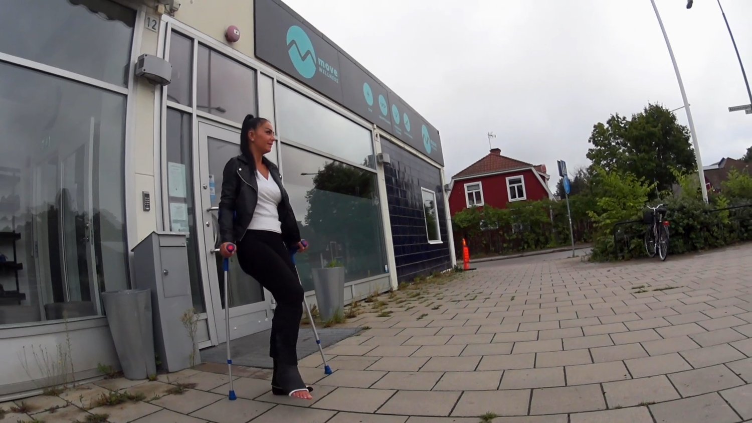 With a black outfit and a black short leg cast can we today see Mika crutch from a store.She cross the streets and crutch along a walkway with her black short leg cast in the air.She stops and put her cast on her ballerina shoe and we get a great closeup of the cast and her toes.This is another great crutching clip with Mika which never disappoints us.