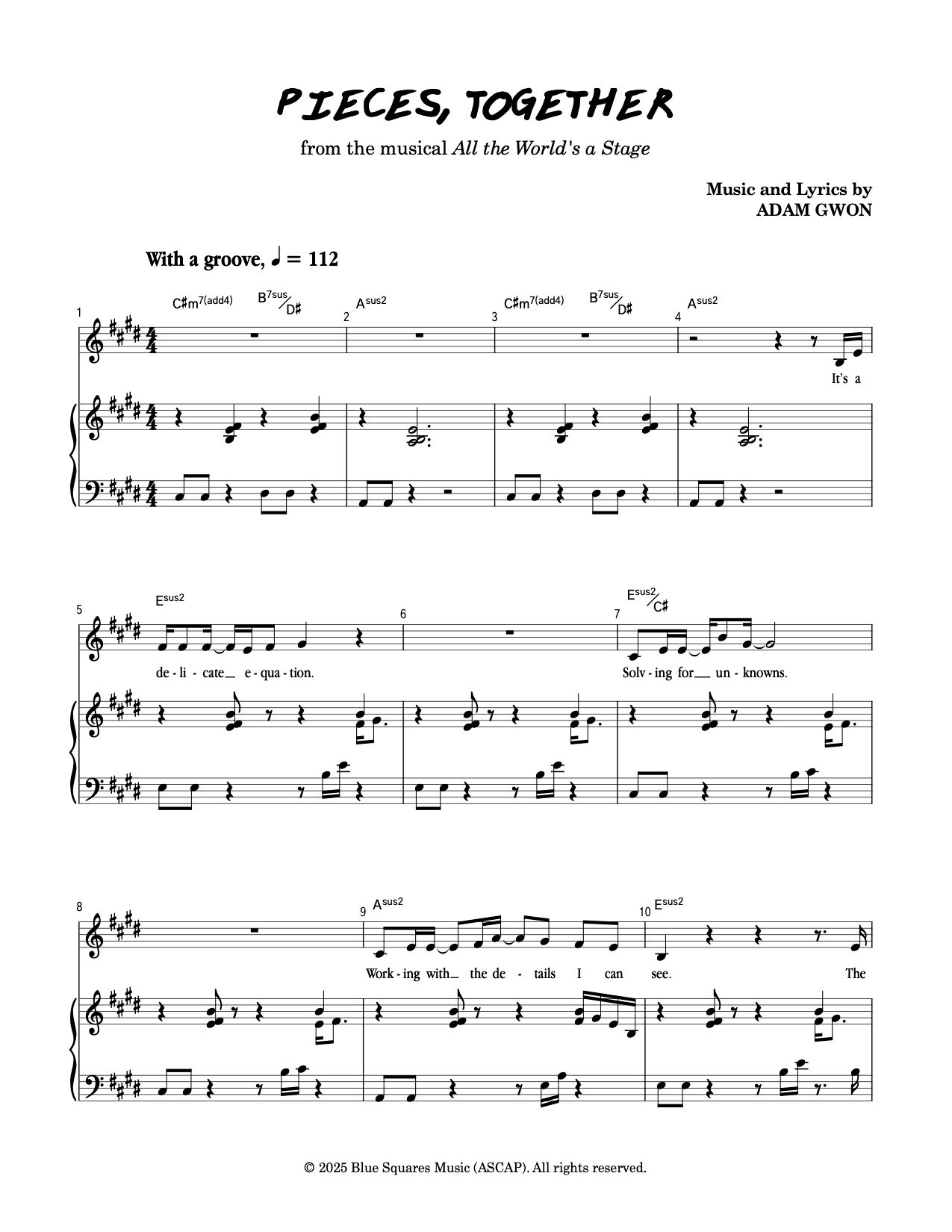 Piano/Vocal sheet music for "Pieces, Together" from All the World's a Stage, available in three keys.