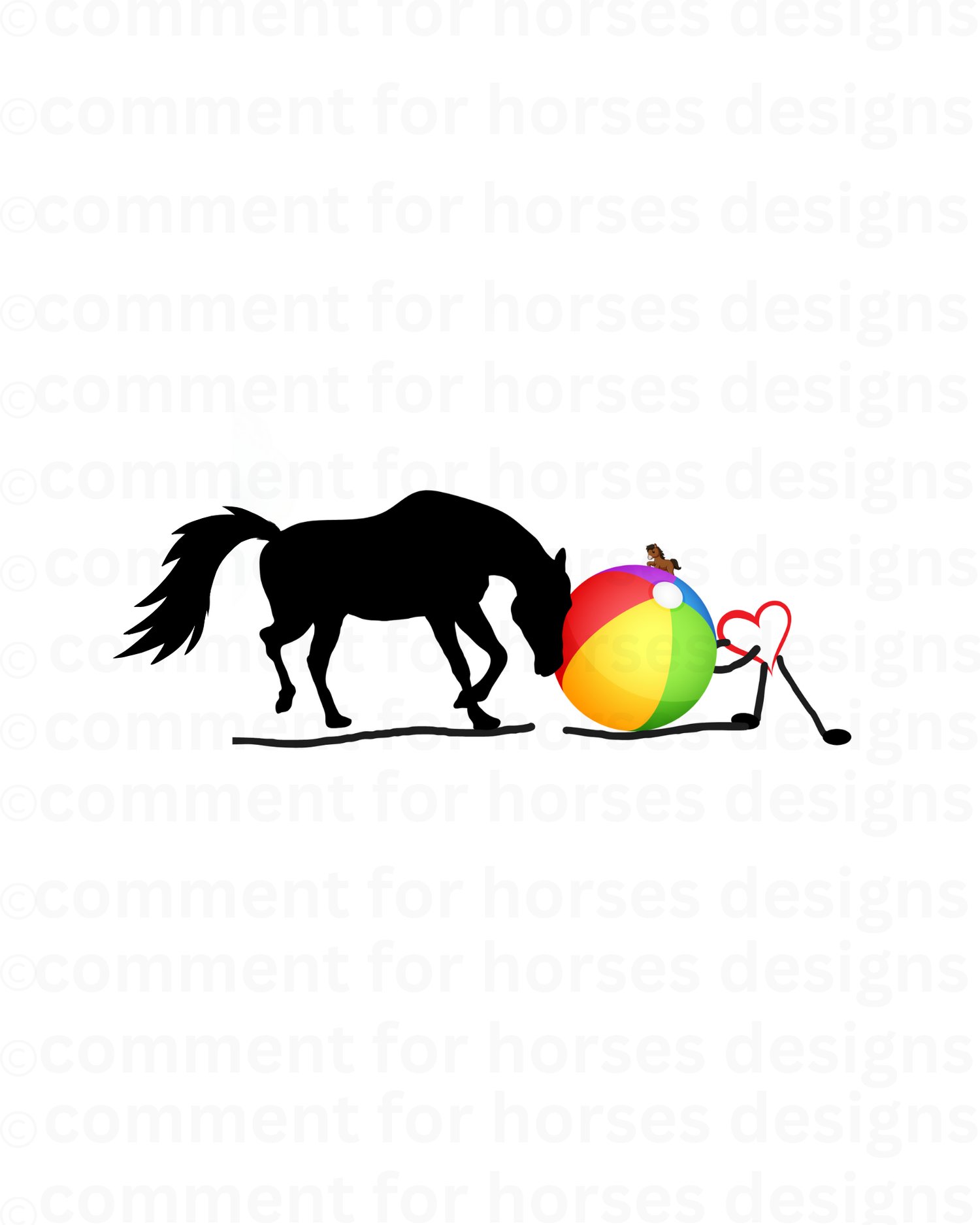A joyful barn moment! This digital illustration captures a playful child with a red heart stick figure and tiny horse giggling atop a colorful beach ball, nudged along by a gentle horse. It’s a snapshot of the special bond between kids and horses. Perfect for horse lovers, parents, or anyone who cherishes barn life’s simple joys.