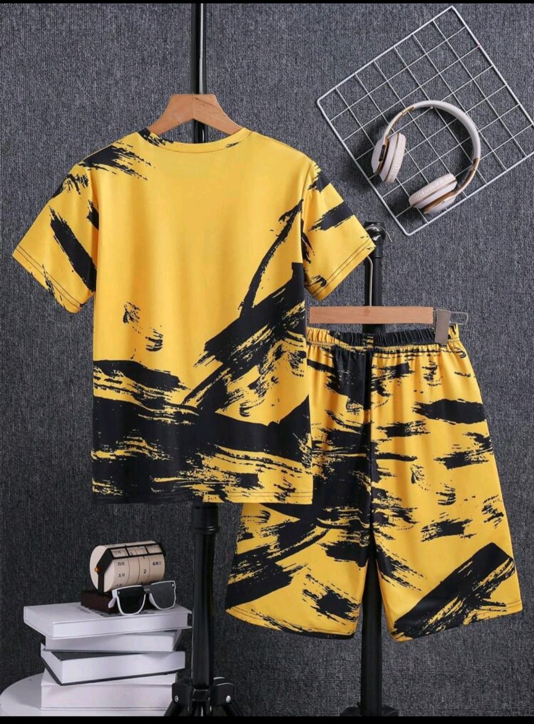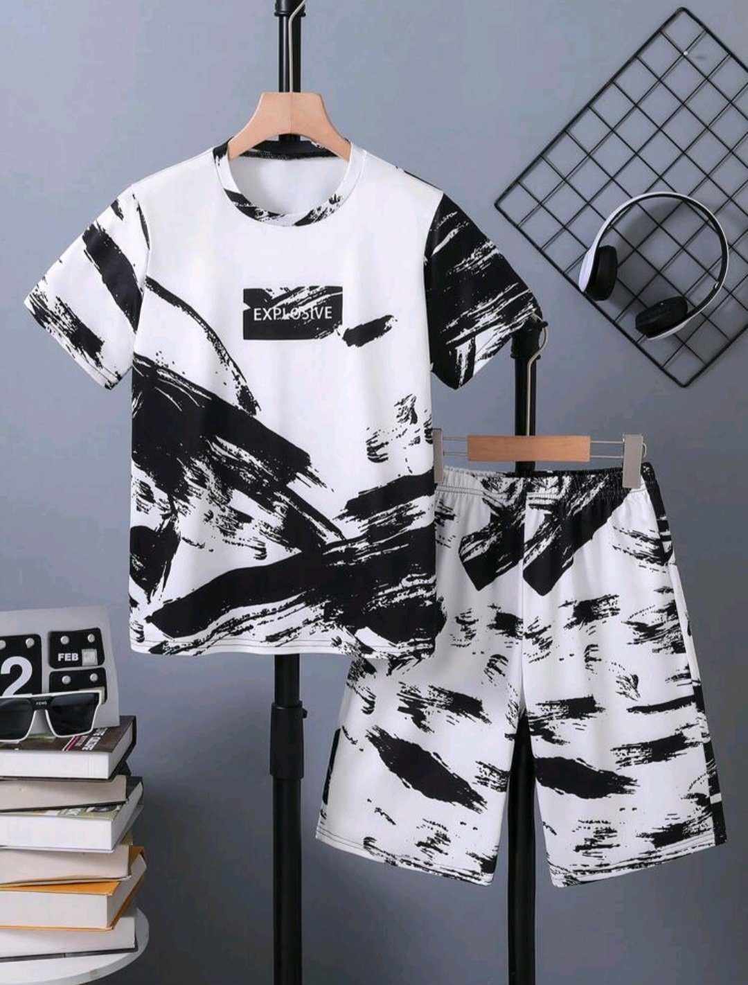 2pcs Set Tween Boys Fashion Graffiti Ink Print Casual Daily Wear & Resort Outfit, Short Sleeve Top And Shorts, Spring/Summer