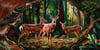 This painting captures the tranquility of the dense forest, two deer and a majestic stag merge with nature. The rays of the sun shine through the dense crowns of the trees