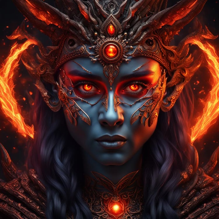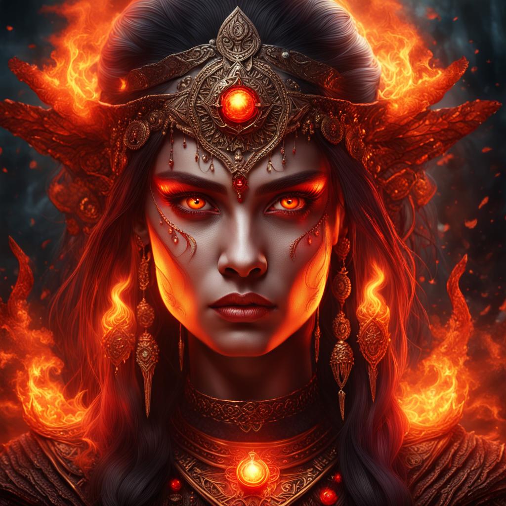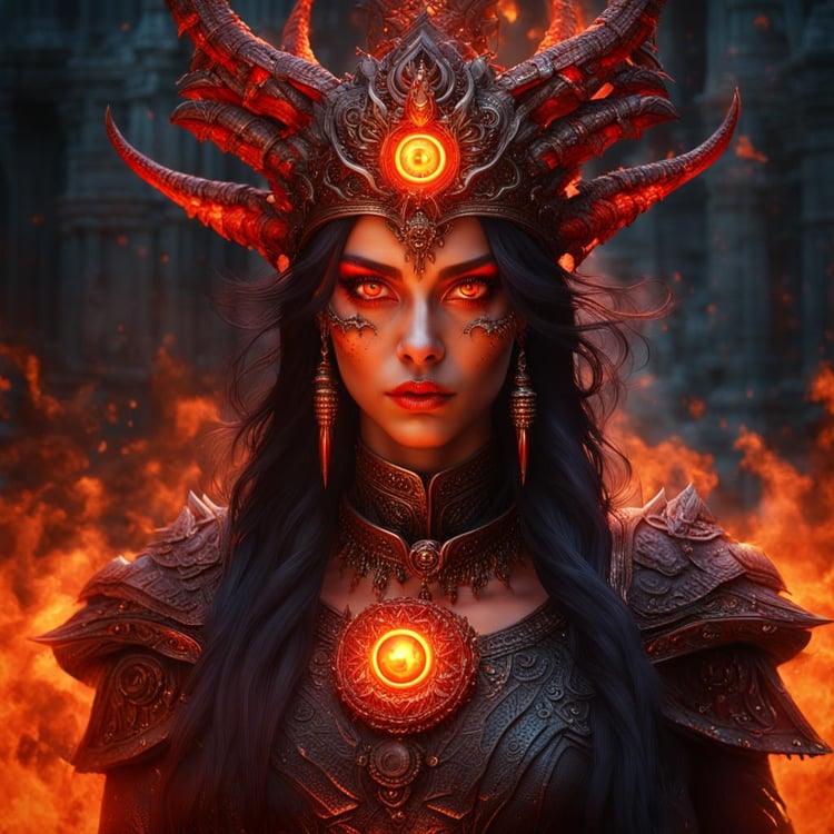 Product Description: Unleash the fiery power of the "Majestic Fire Sorceress Queen," a photorealistic digital portrait capturing the intense gaze and commanding presence of a sorceress queen in the Inferno Temple. With glowing red eyes and regal attire, she exudes majesty and raw power.
